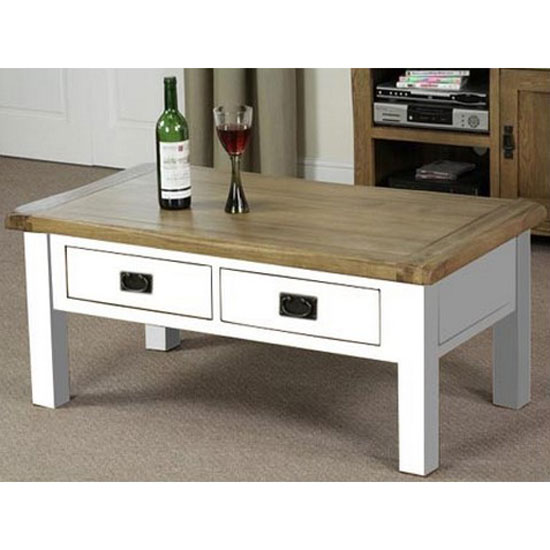 The rustic four-drawer coffee table features a neat and trim appearance. This rectangular piece is stabilized by four short and stout feet. The table is built out of quality material for lasting service.