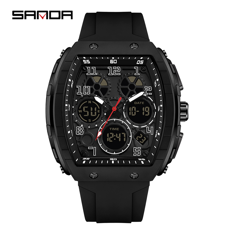 SANDA best selling explosions 6157 barrel multifunctional electronic watch Trendy barrel-shaped shell, double-display dial design, face value and strength coexist! Day, date, time and running seconds are displayed in four windows, which is convenient to see at a glance! A variety of functions can easily meet daily needs: countdown, time between two places, alarm clock and the hour, running seconds, day of the week, 12/24 hour system! Built-in electronic luminous movement, one-button bright screen, with fluorescent pointer, you can still see the time clearly in the dark! 50M depth waterproof, sealed waterproof system, no fear of splashing and getting wet, more comfortable to wear every day! High transparent acrylic mirror, clear mirror, abrasion and scratch resistance! Soft silicone strap, comfortable to wear, not easy to deform and change color! Cross-border platform selling styles, a variety of color choices, suitable for a variety of occasions!