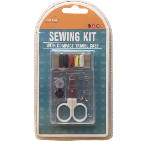 Including: 5 rolls of thread, needle stringer, sicssors, 2 buttons, 2 pins