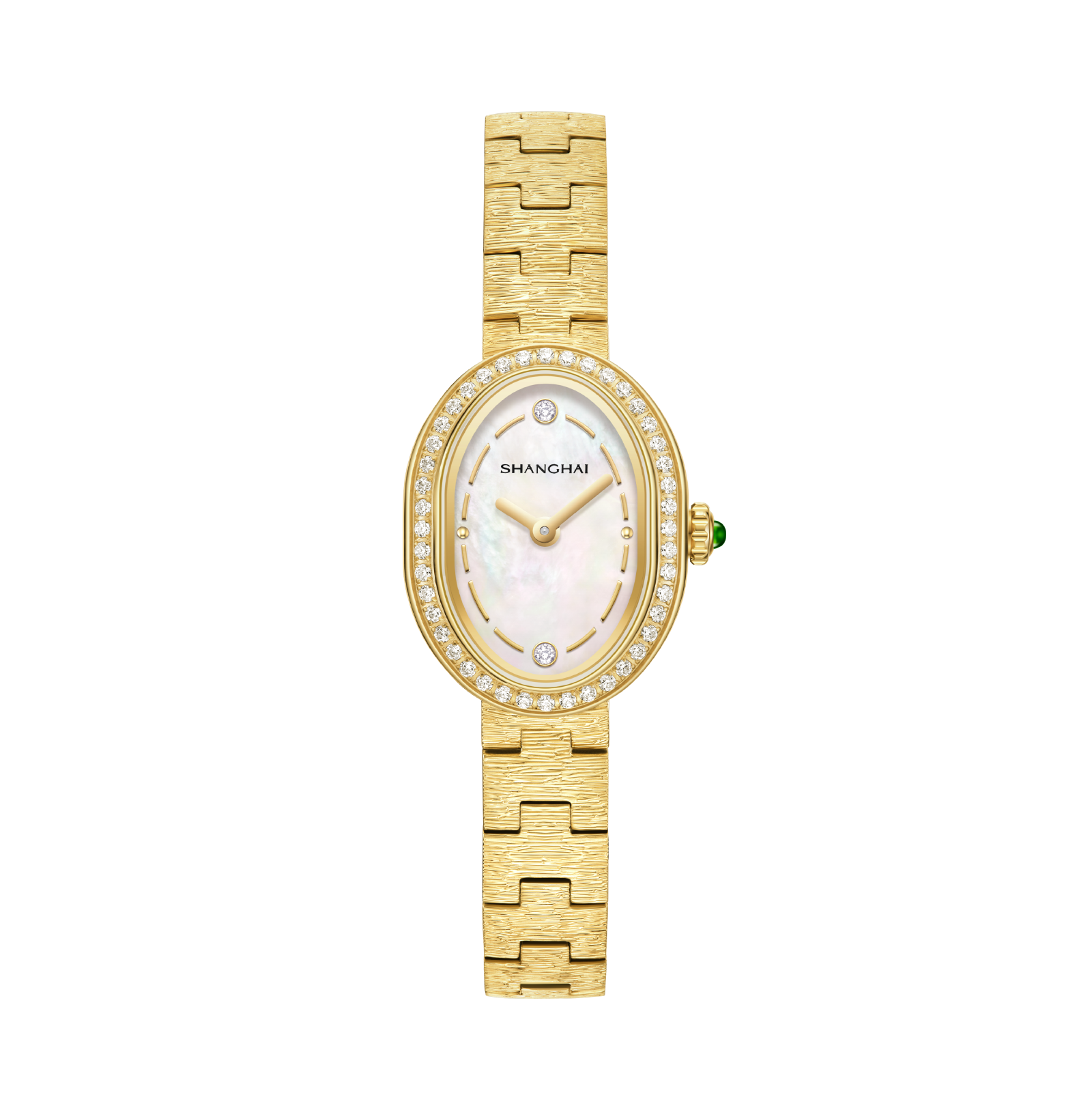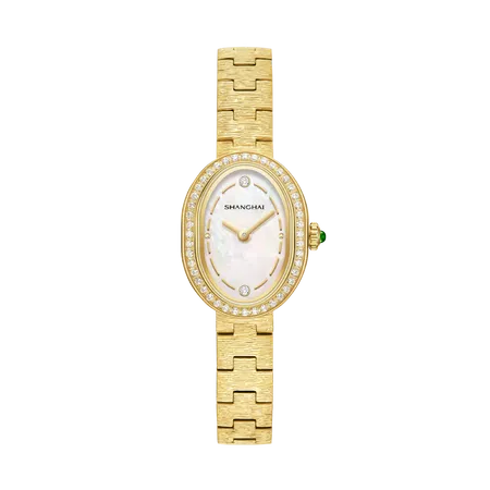 The SHANGHAI Watch SH LADIES Collection Light Glow Watch features a unique oval design with a petite oval case, complemented by a sparkling zirconia bezel and a vintage-inspired bark-textured metal bracelet, showcasing the neon charm of Shanghai.