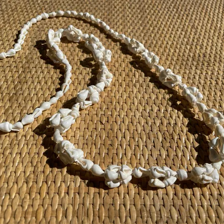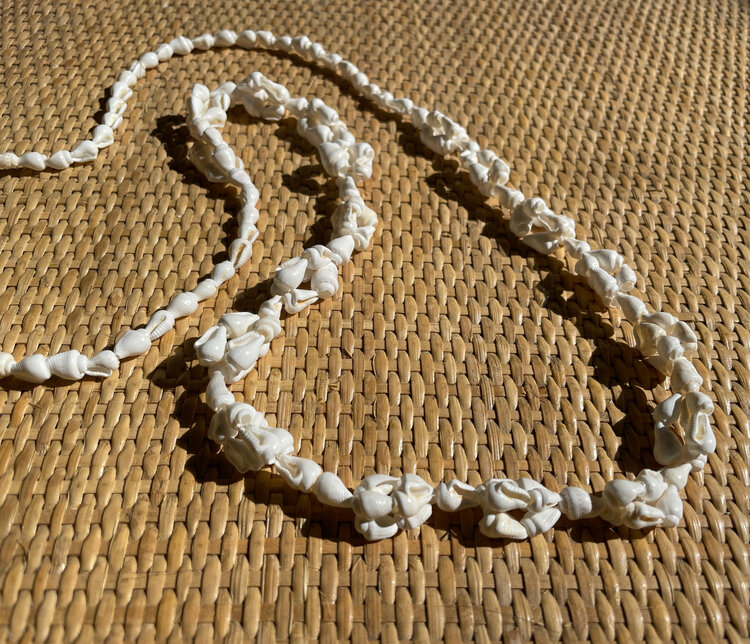 Beautiful all natural seashell necklace in a pattern formation. Possibly was a souvenir form a trip to Hawaii once upon a time. Wears over the head. Measures 46 cm long (so 92 cm in total length of chain). 2 available (I’ll be keeping 1 !).