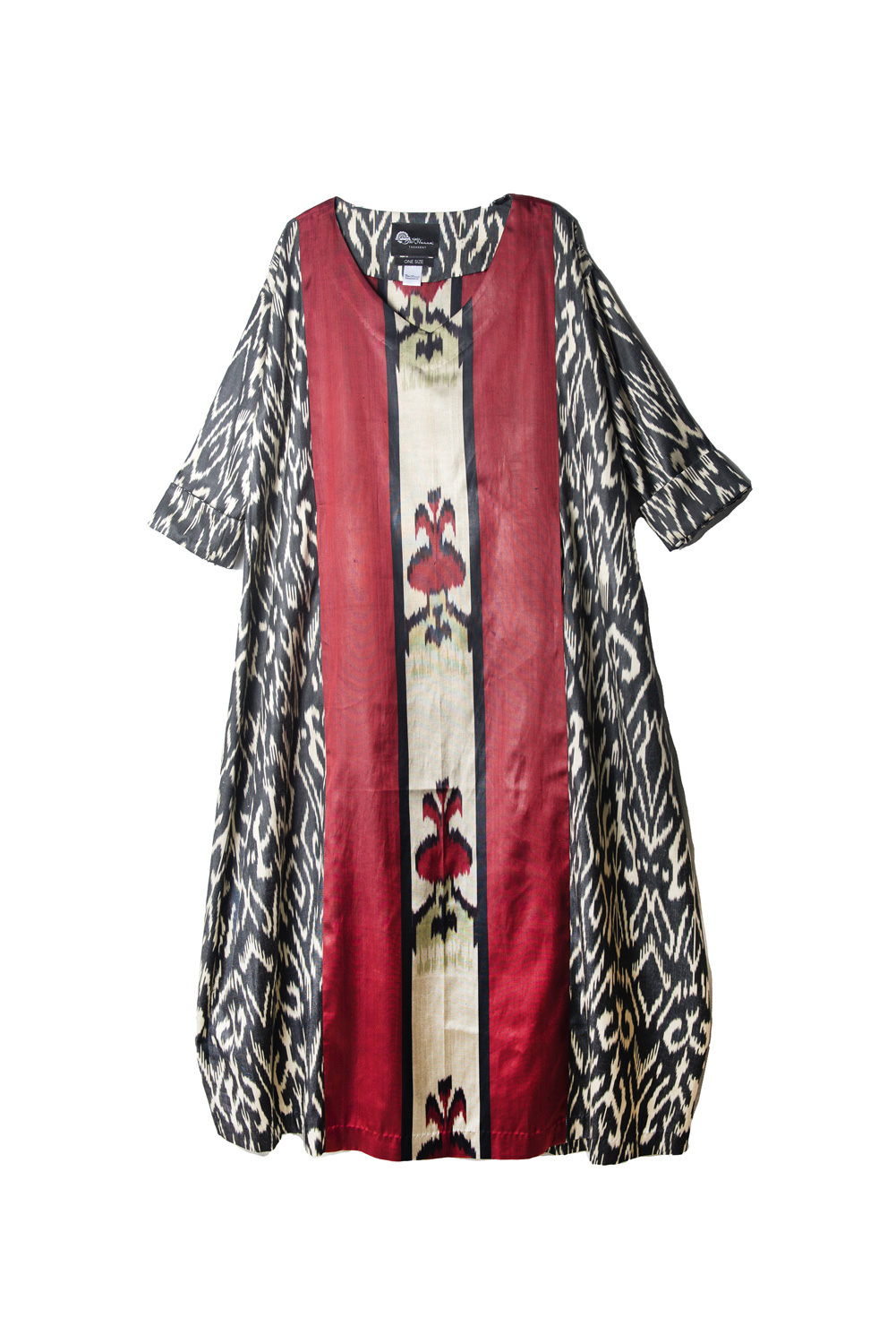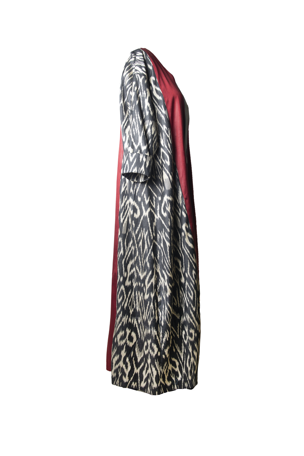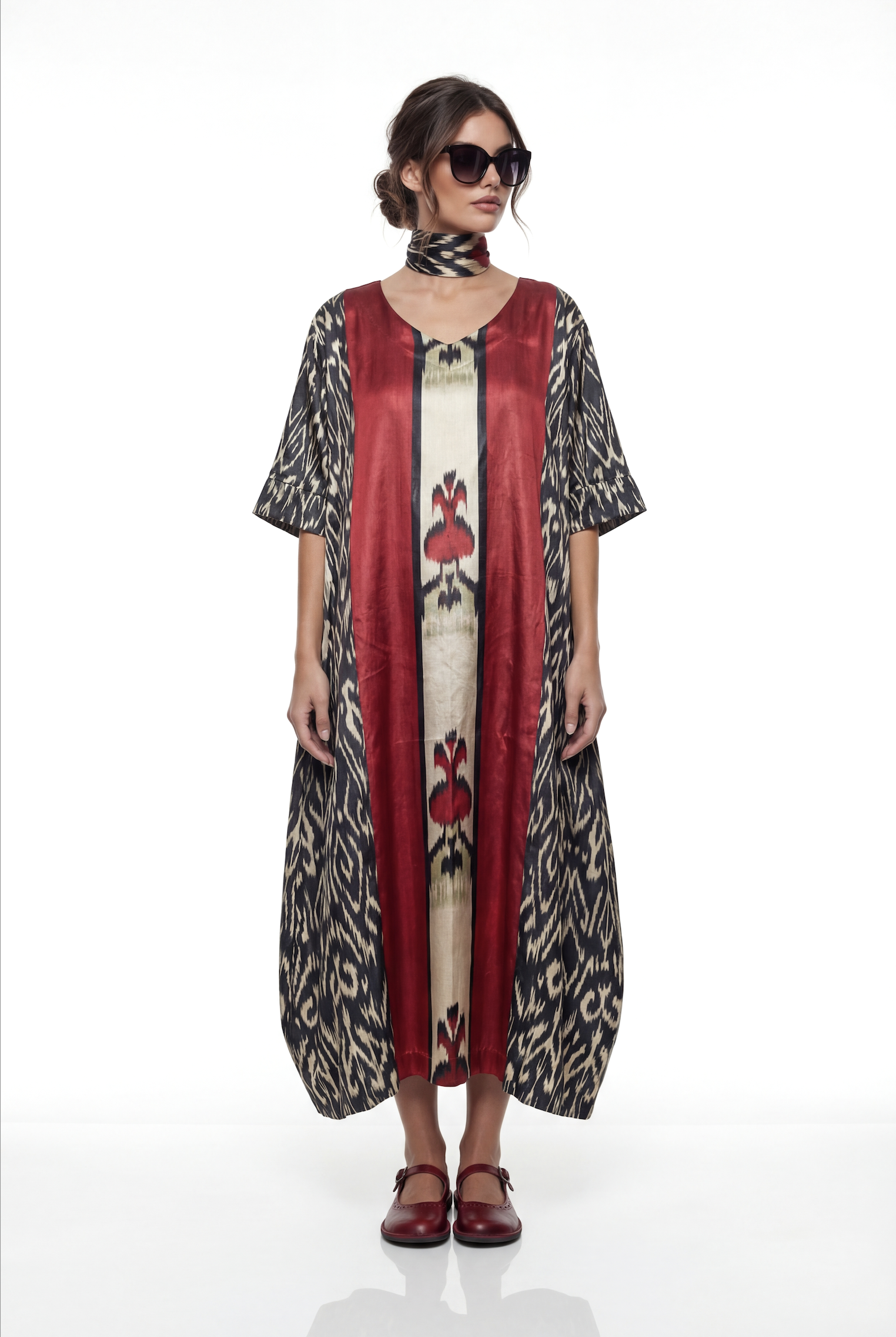 This dress features two distinct silk ikat fabrics. V-neckline with slightly dropped shoulder sleeves with folded cuff. Quarter long sleeves. Medium length.