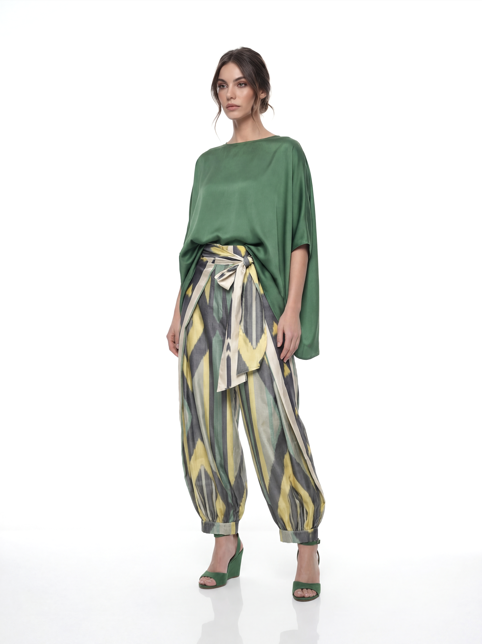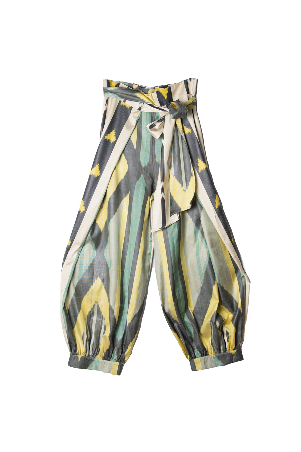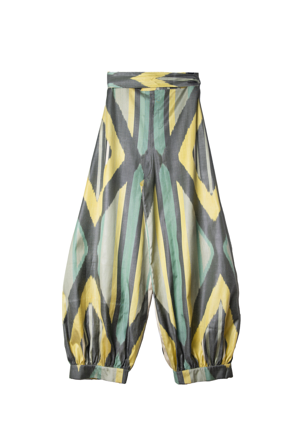These wide-leg harem pants are crafted from handwoven silk-cotton ikat, thoughtfully combining two distinct patterns for a reversible design. Designed in a one-size fit with a wrap waistband, they offer effortless comfort, fluid movement, and versatile style — a refined piece that blends artisanal craftsmanship with relaxed sophistication.