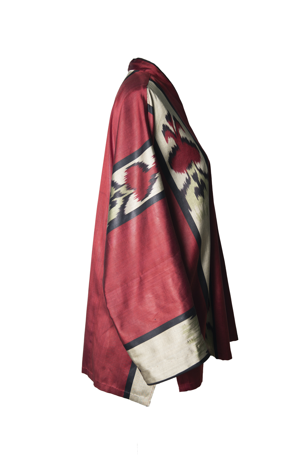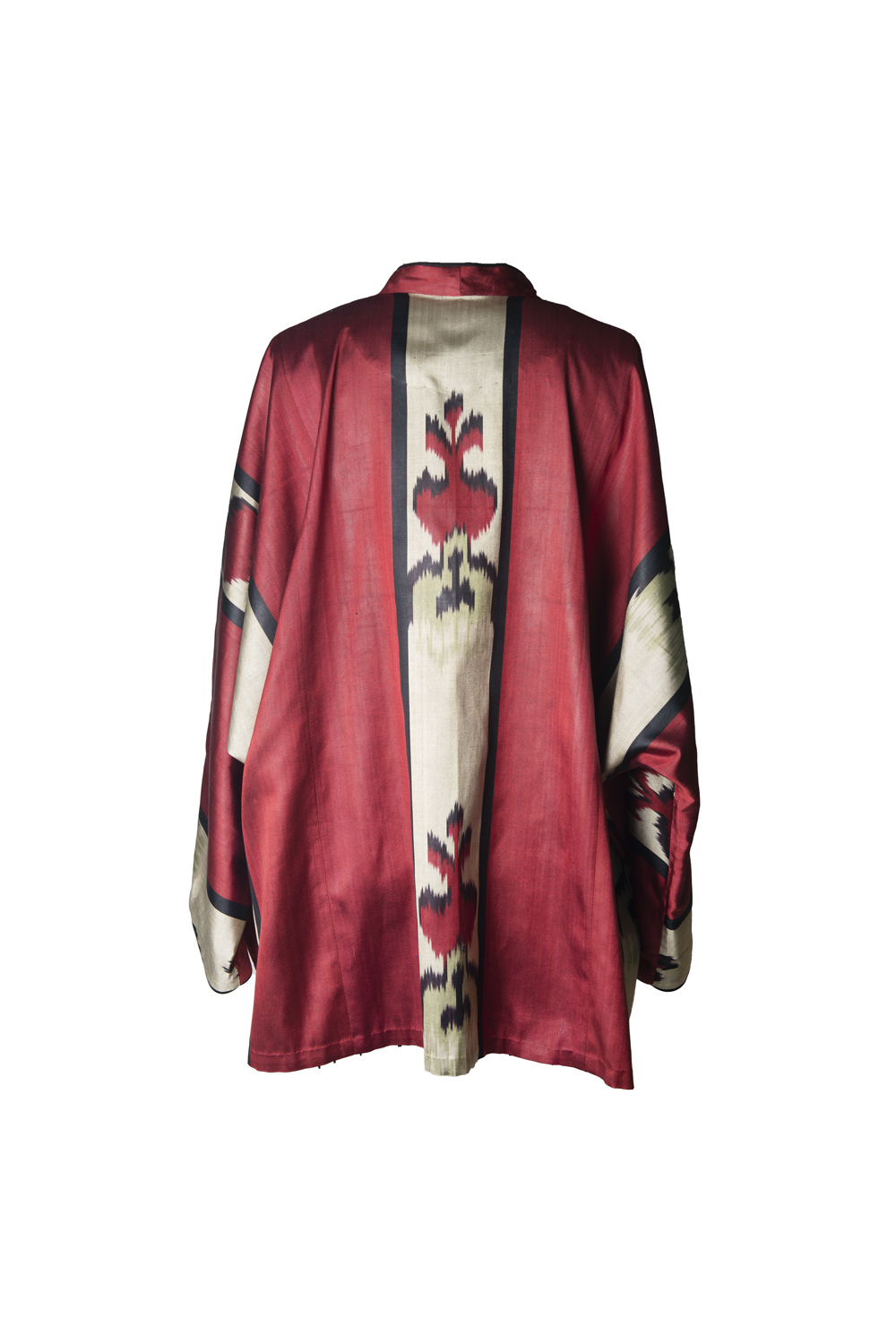 This versatile summer jacket is crafted from handwoven silk-cotton ikat, showcasing kimono cut for a modern, elegant silhouette. Designed in a one-size fit, it features a graceful V-neckline, long sleeves with folded hems, and side slits for effortless movement — a refined piece that combines artisanal craftsmanship with contemporary ease. Piping along the front. Fabric covered buttons.