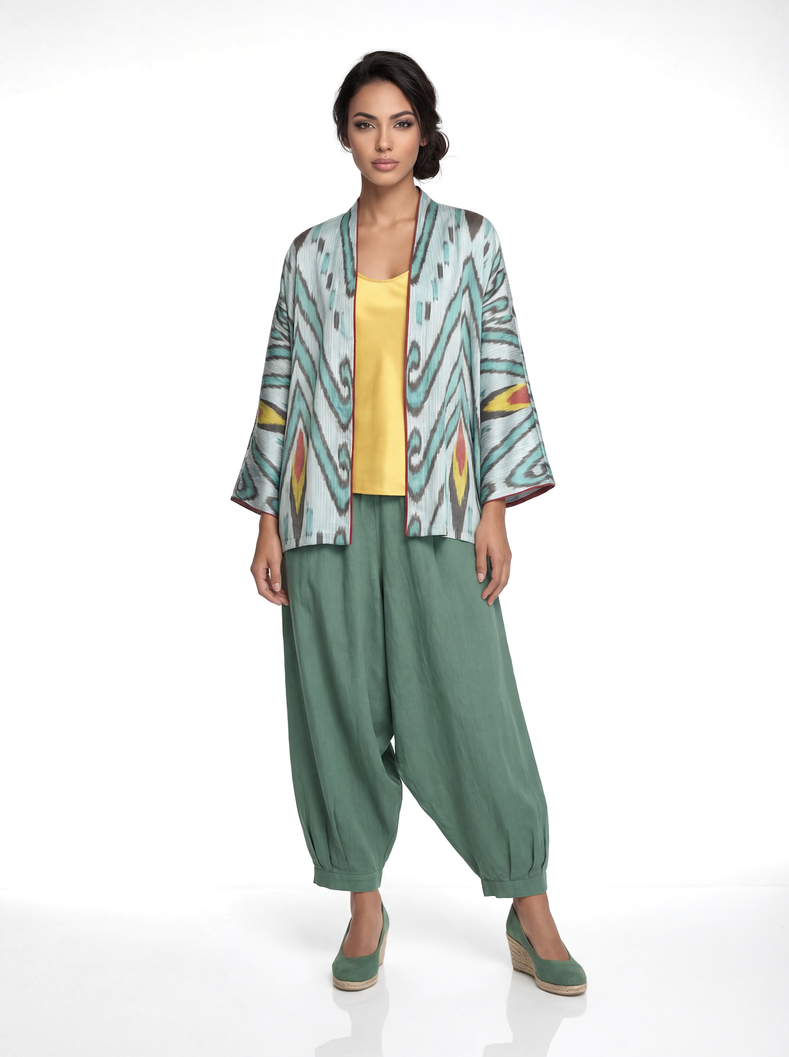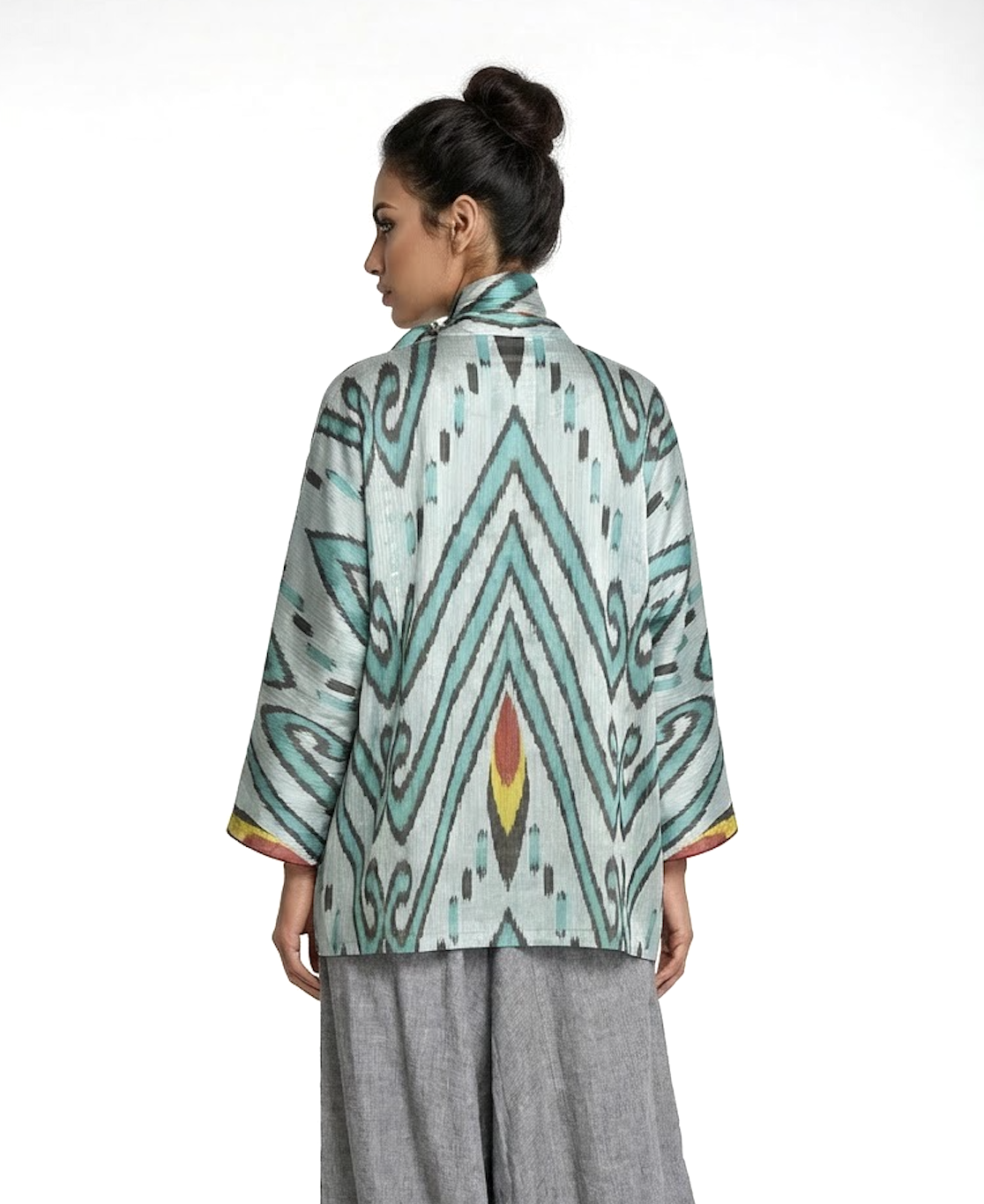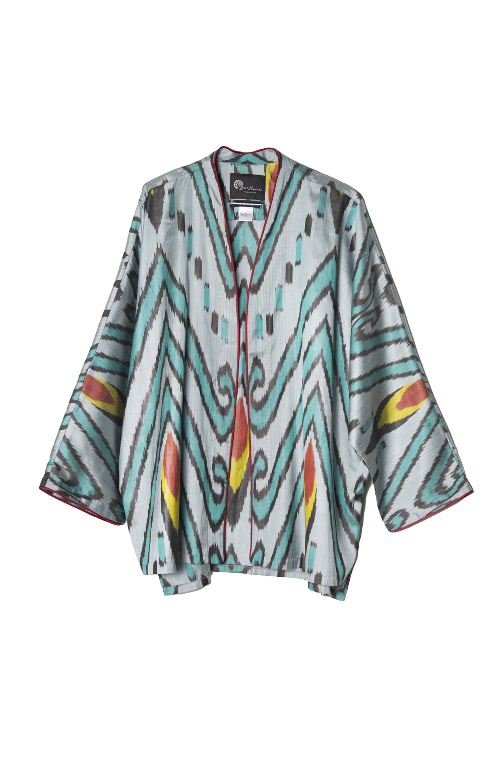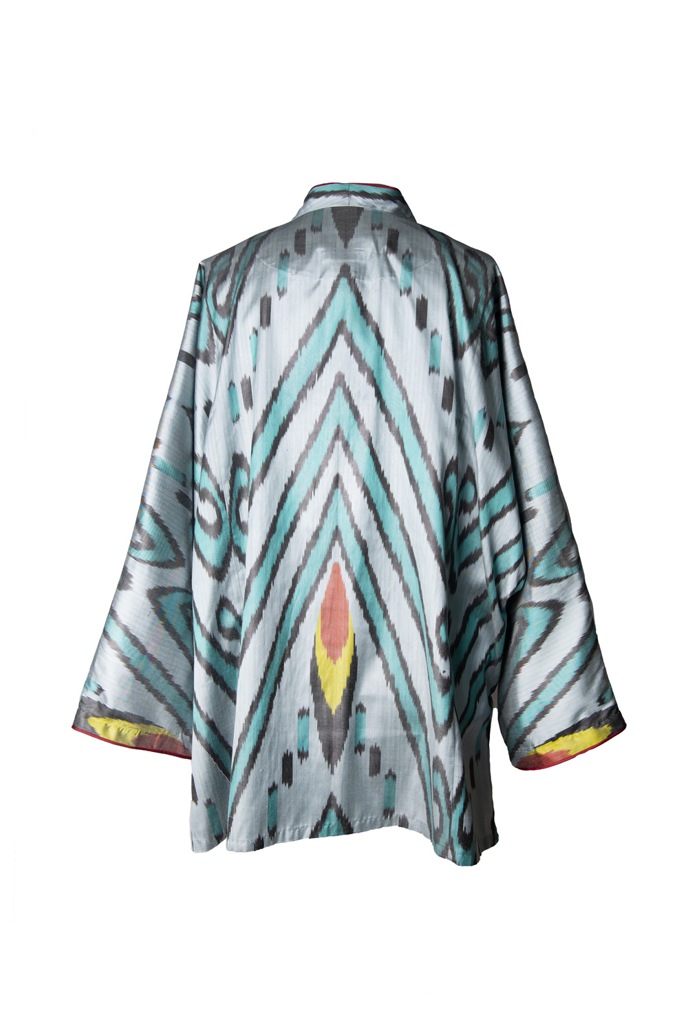 This versatile summer jacket is crafted from handwoven silk-cotton ikat, showcasing kimono cut for a modern, elegant silhouette. Designed in a one-size fit, it features a graceful V-neckline, long sleeves with folded hems, and side slits for effortless movement — a refined piece that combines artisanal craftsmanship with contemporary ease. Piping along the front. Fabric covered buttons.