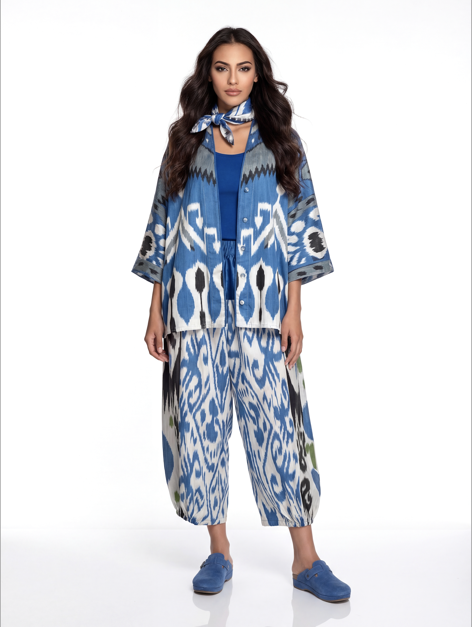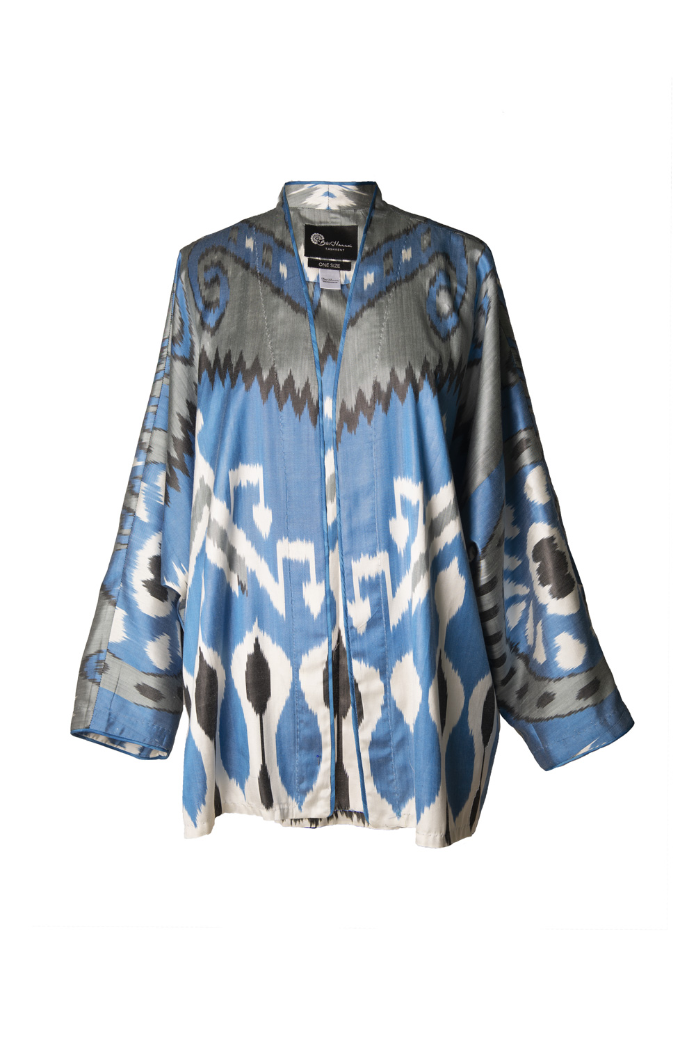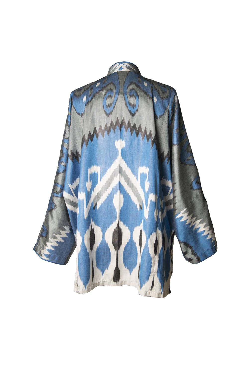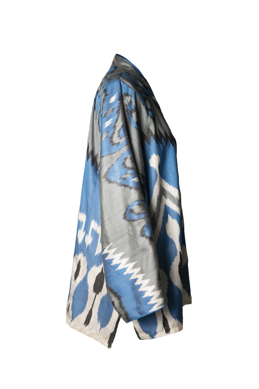 This versatile summer jacket is crafted from handwoven silk-cotton ikat, showcasing kimono cut for a modern, elegant silhouette. Designed in a one-size fit, it features a graceful V-neckline, long sleeves with folded hems, and side slits for effortless movement — a refined piece that combines artisanal craftsmanship with contemporary ease. Piping along the front. Fabric covered buttons.