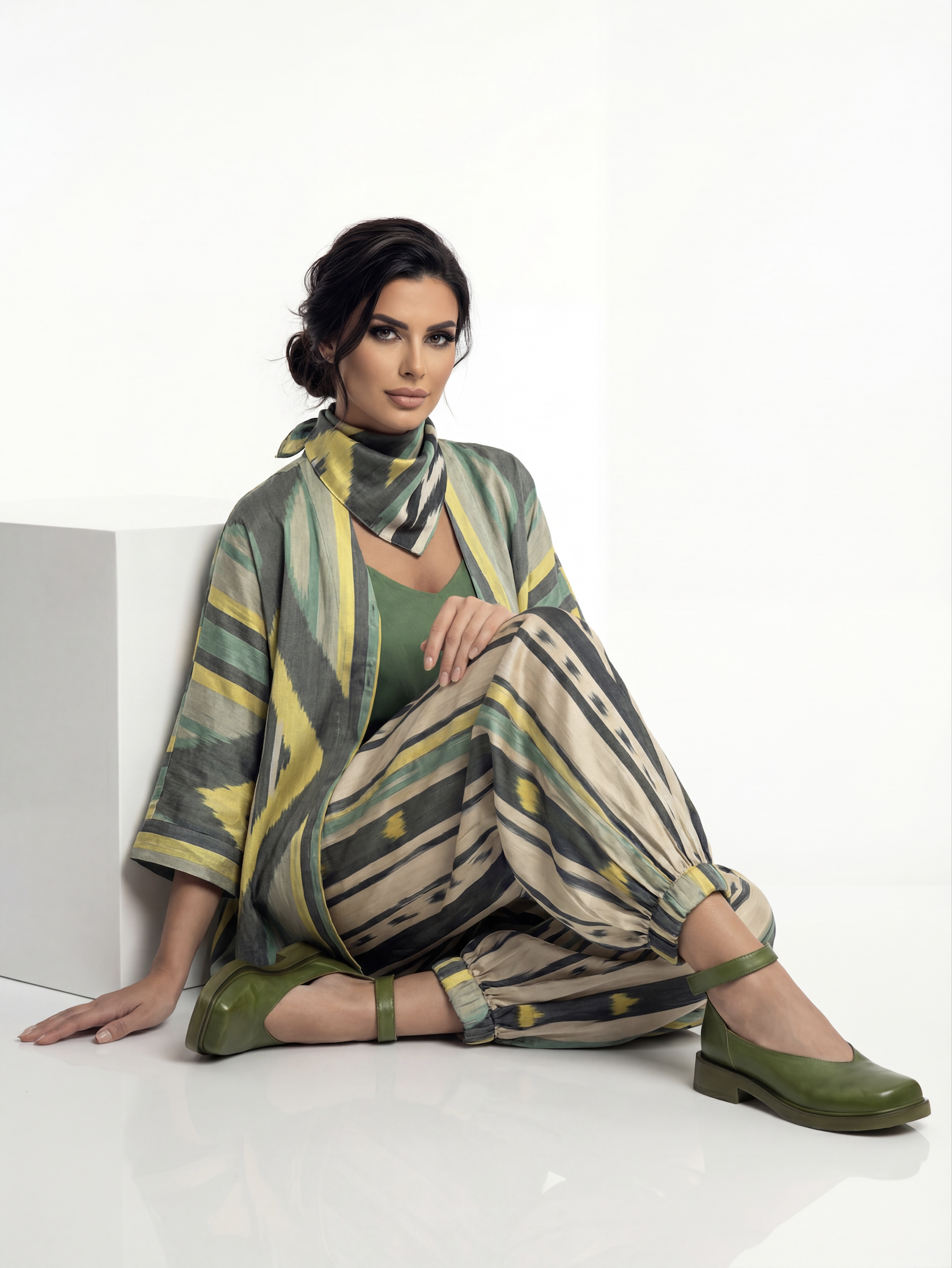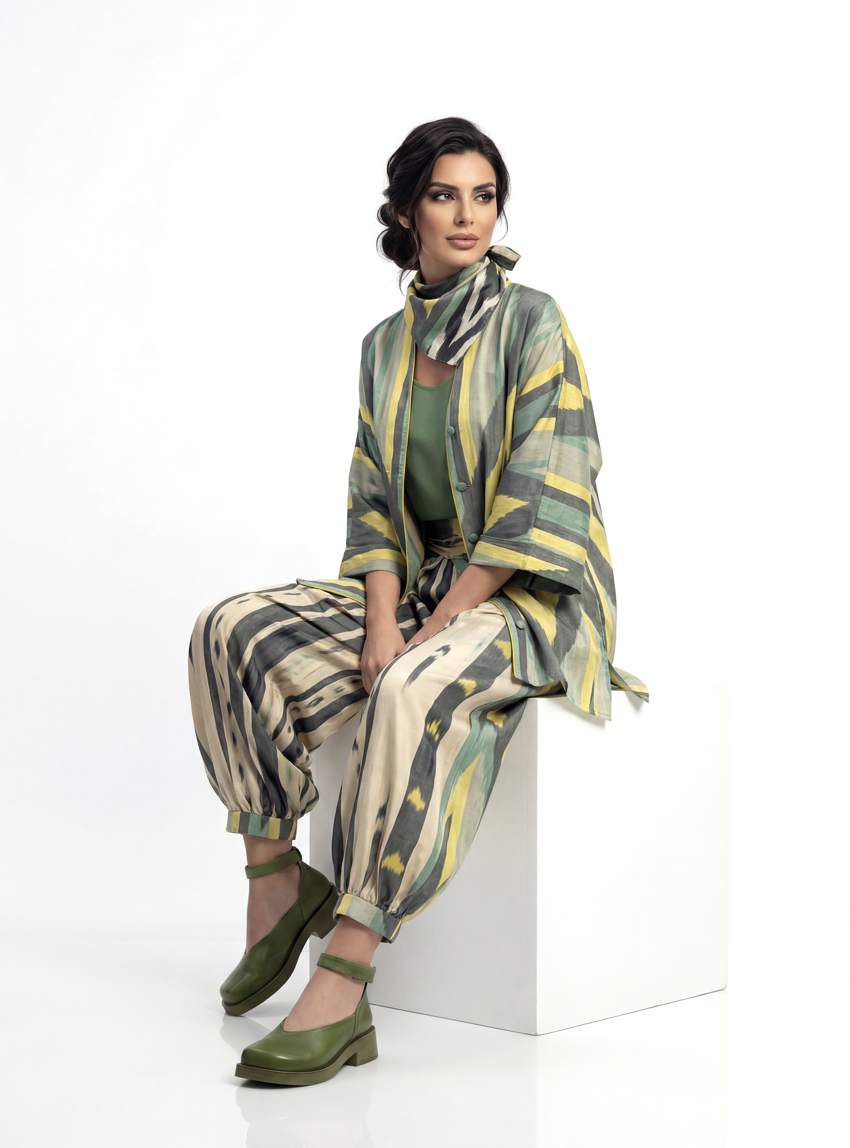 This versatile summer jacket is crafted from handwoven silk-cotton ikat, showcasing kimono cut for a modern, elegant silhouette. Designed in a one-size fit, it features a graceful V-neckline, long sleeves with folded hems, and side slits for effortless movement — a refined piece that combines artisanal craftsmanship with contemporary ease. Piping along the front. Fabric covered buttons.