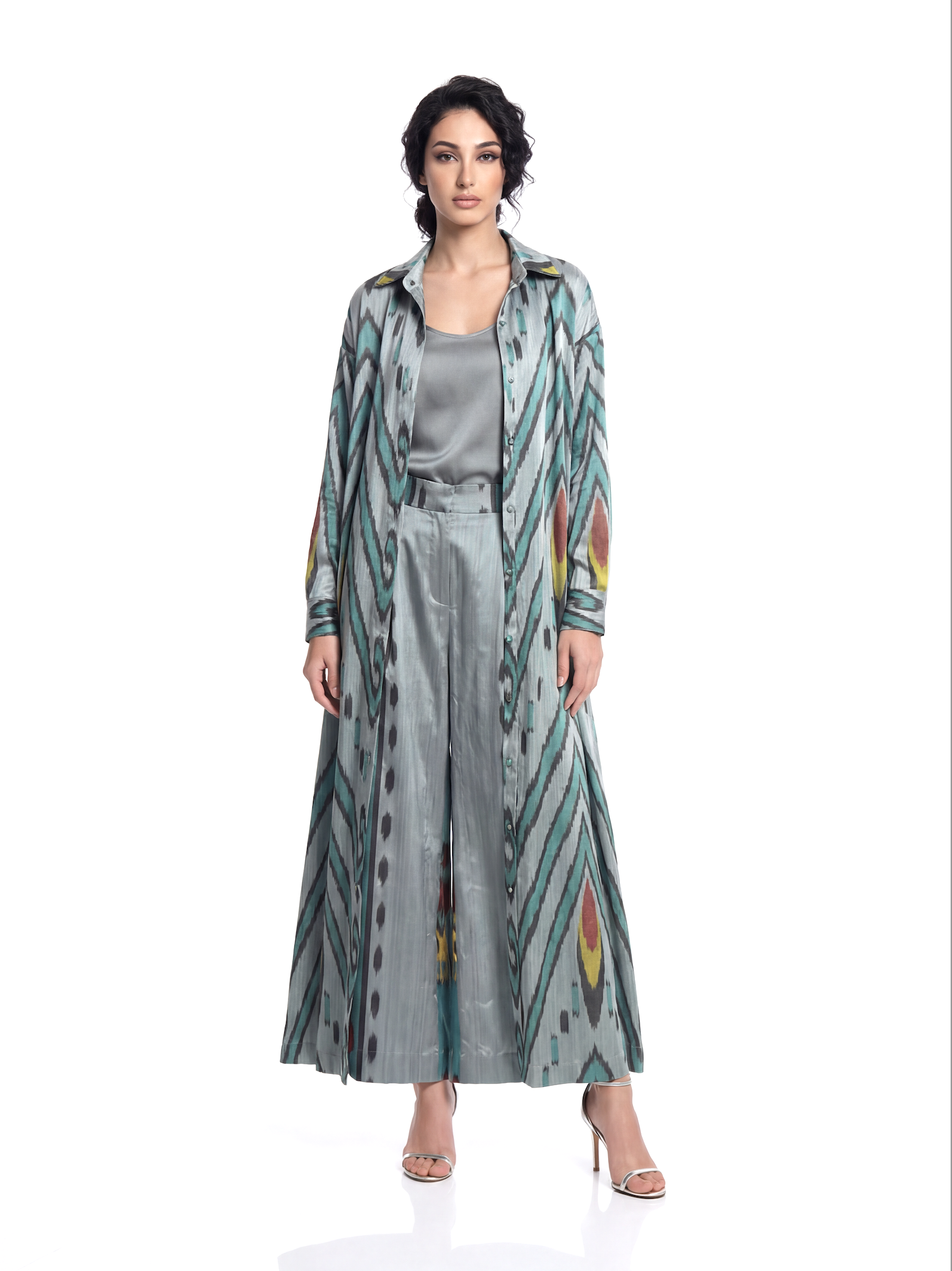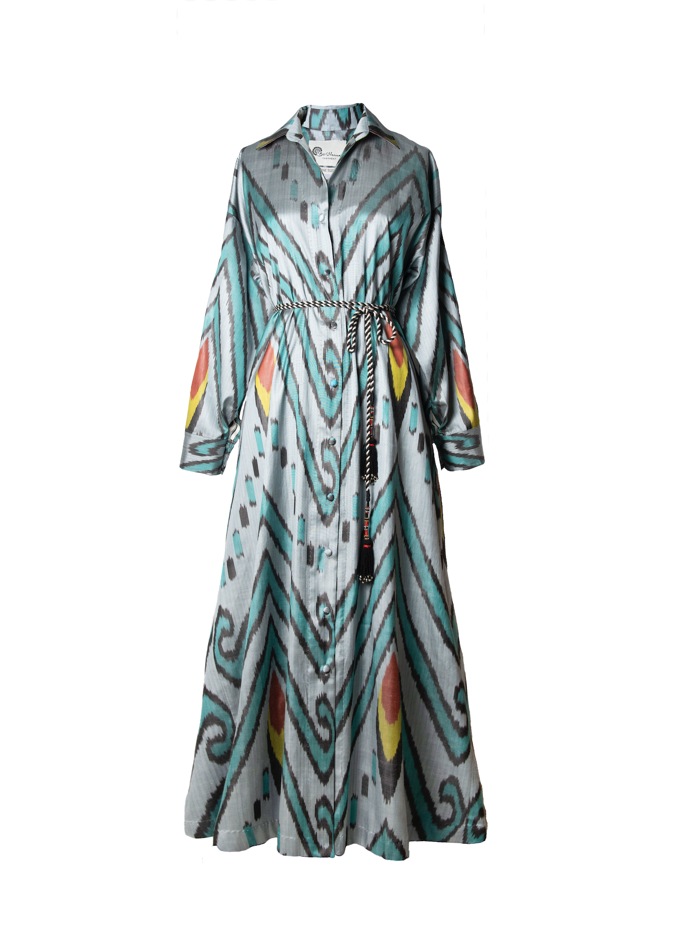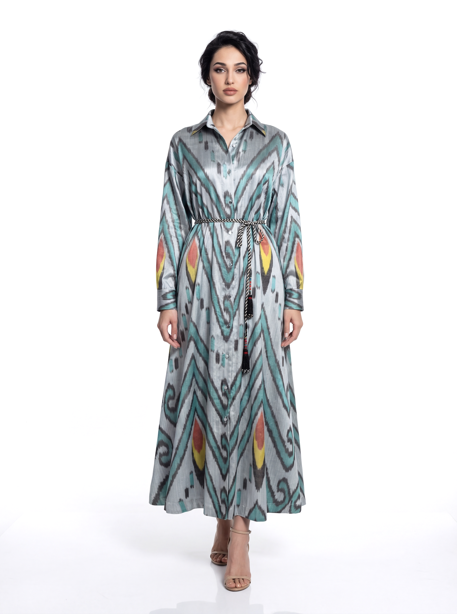 This flared shirt dress carries the soul of hand-woven silk ikat — a pattern created only once by master artisans. Its relaxed drop shoulder, English collar, and fabric-covered buttons give it an effortless, modern grace.