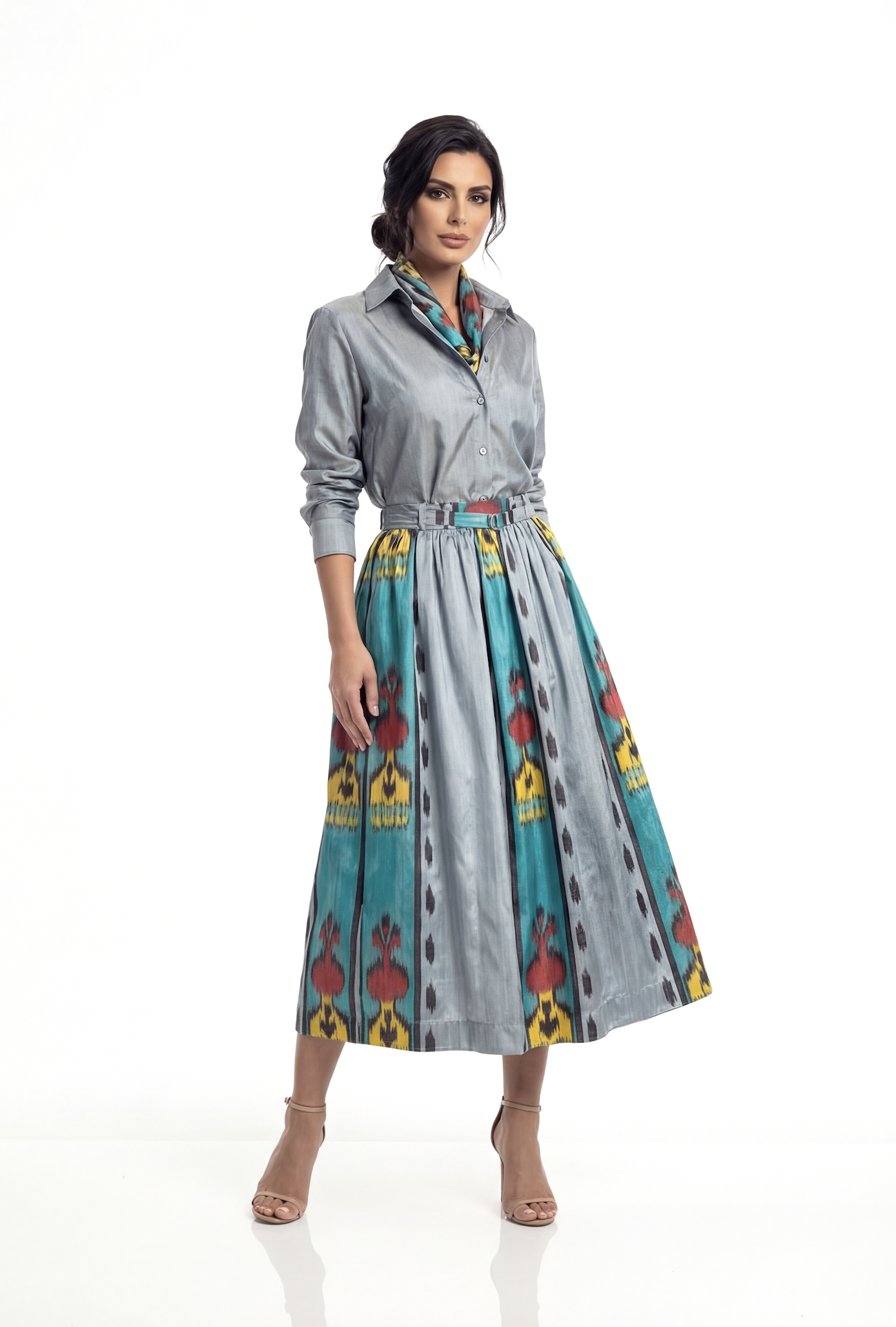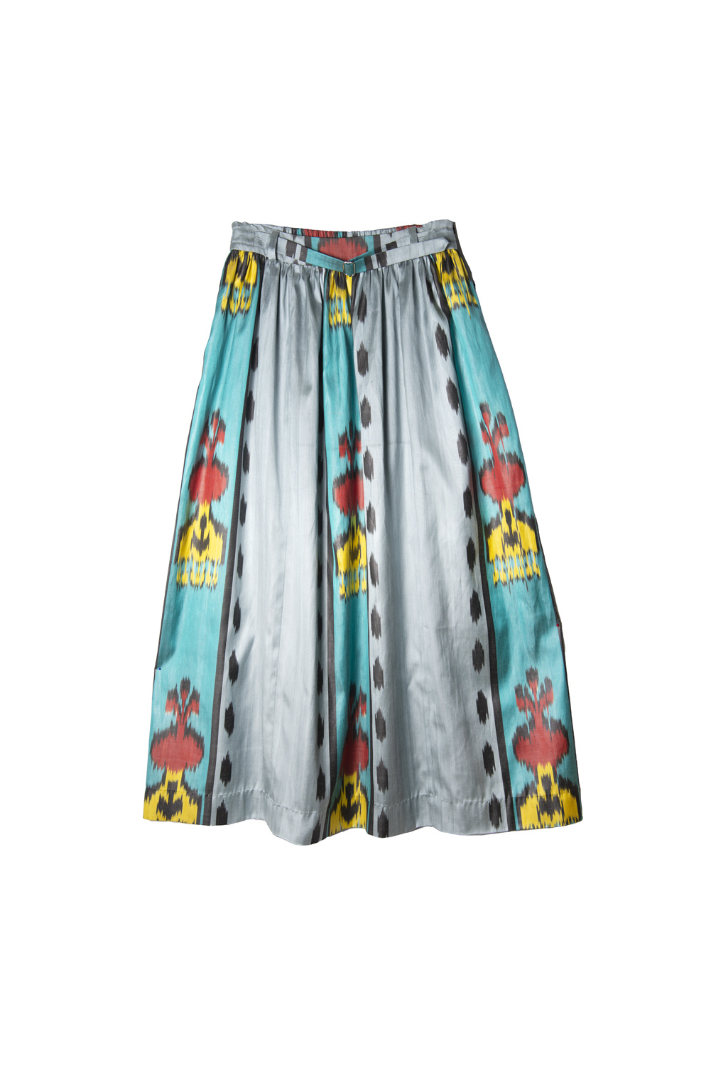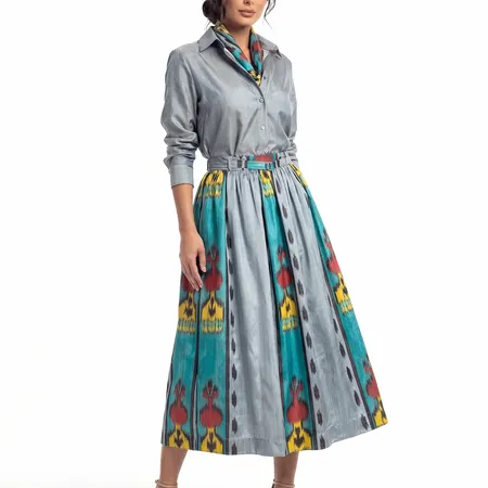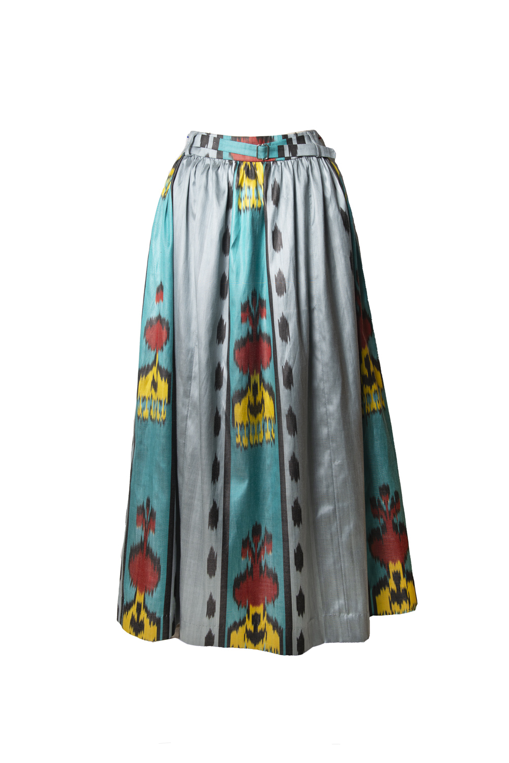This flared silk ikat skirt has a medium length. Waist band with attached belt. Zipper closure from one side.