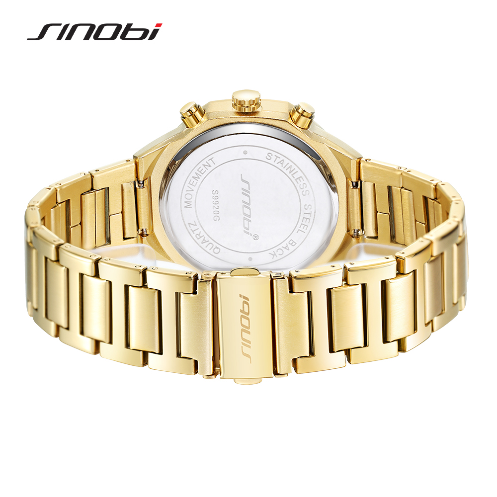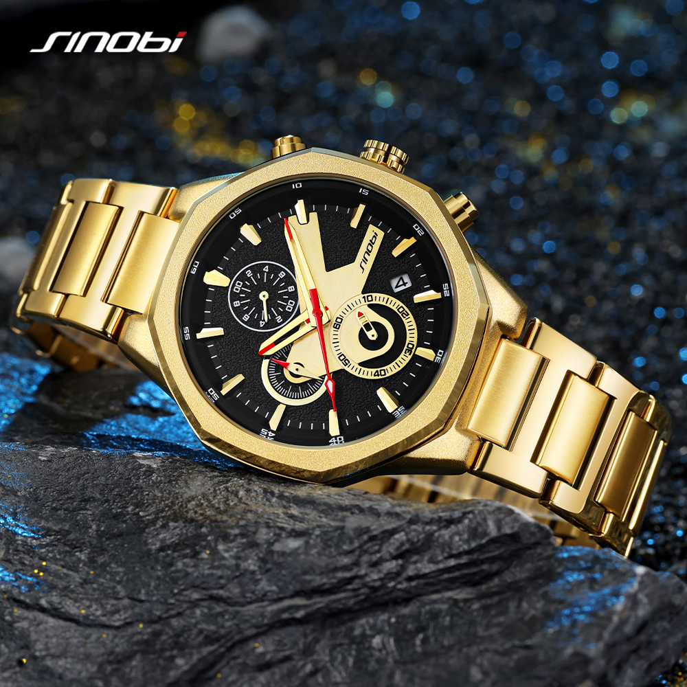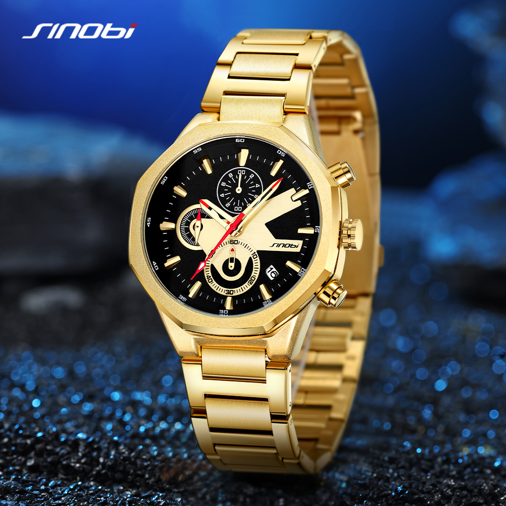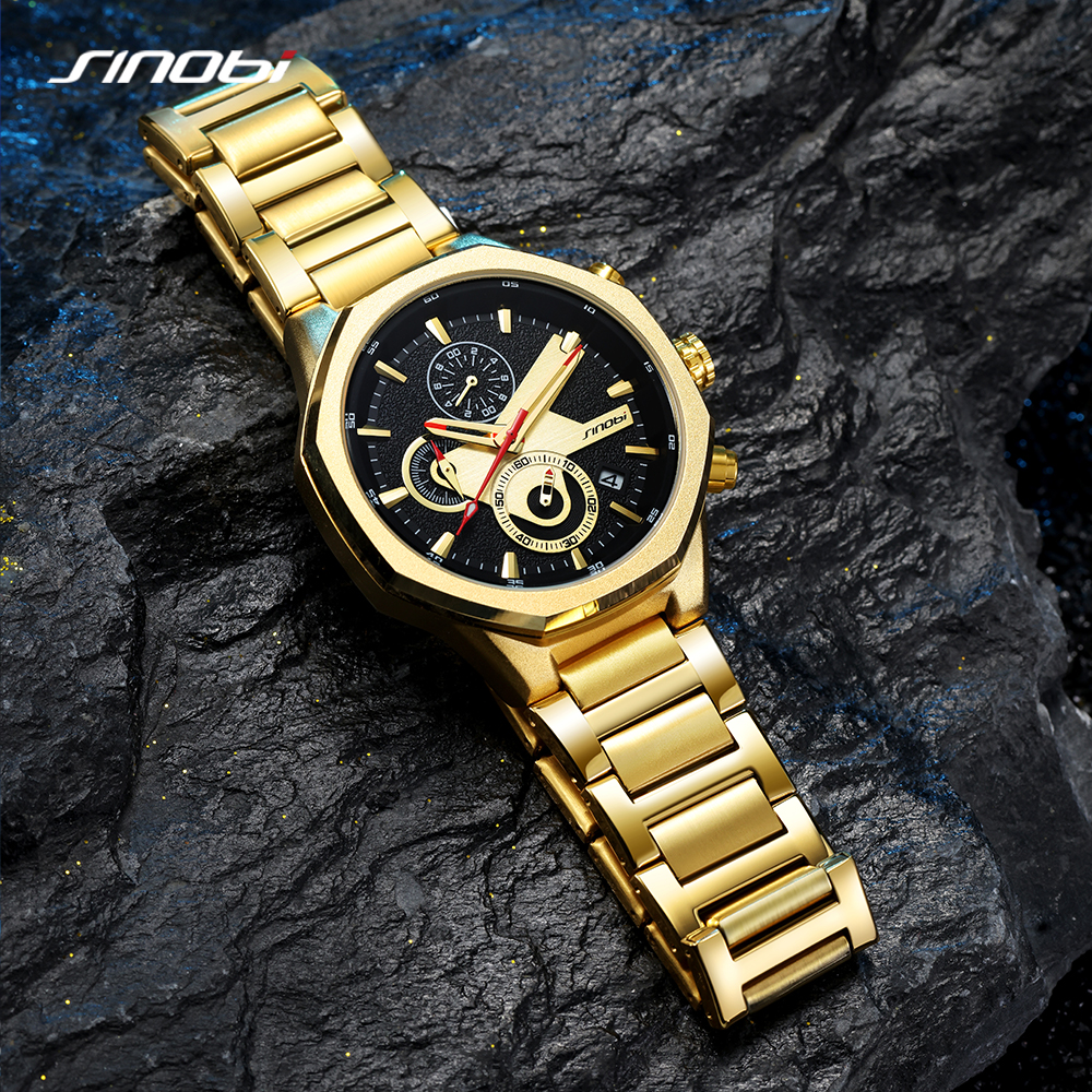 SINOBI Golden Men's Wristwatches Luxury Quartz Stainless Steel Multifunction Man Watch Irregular Chronograph Men Watches
