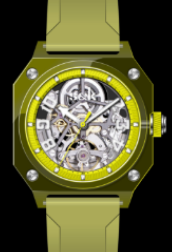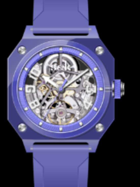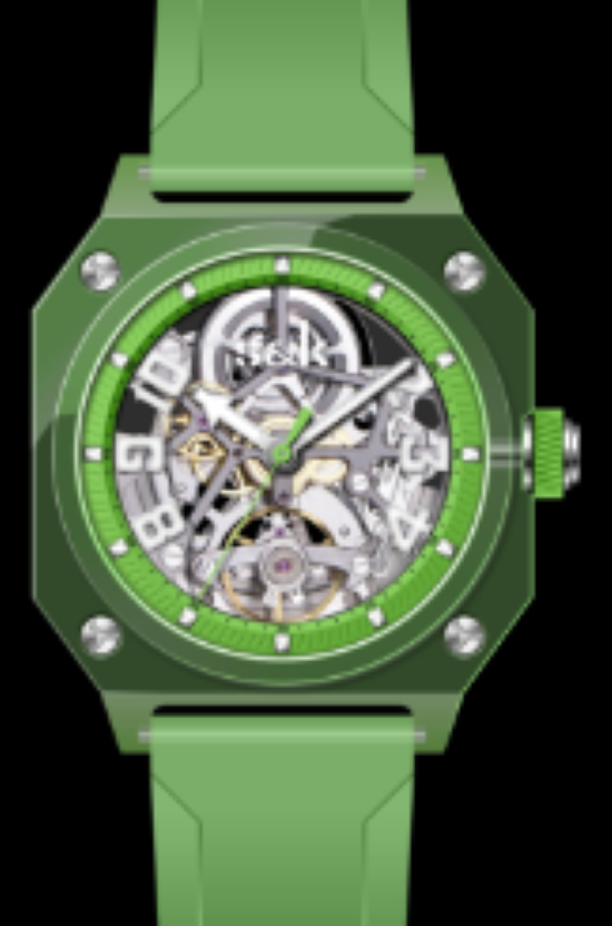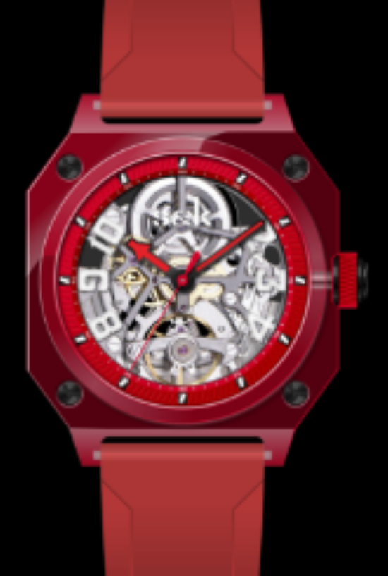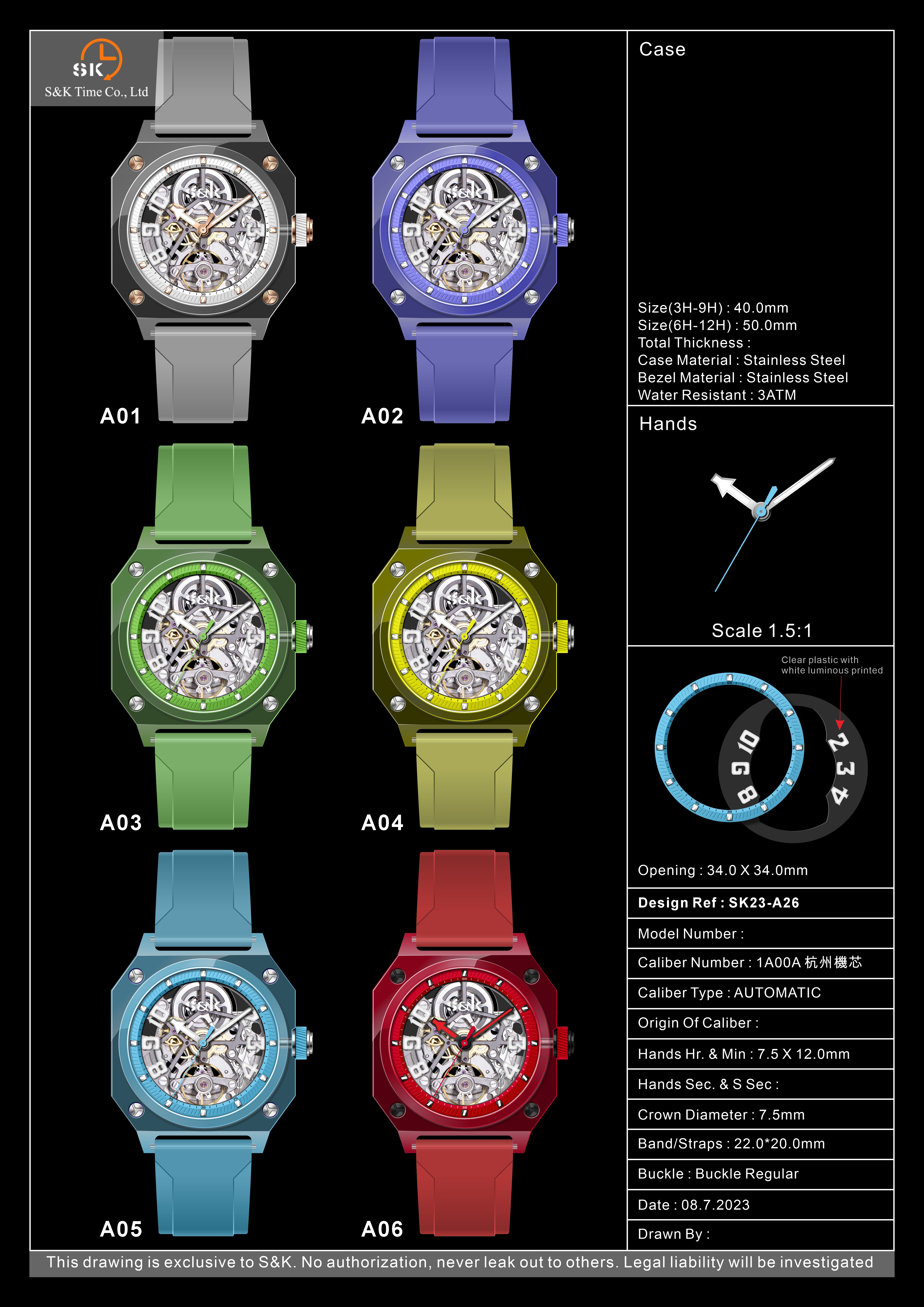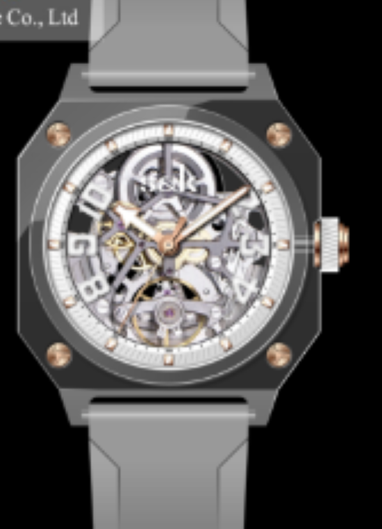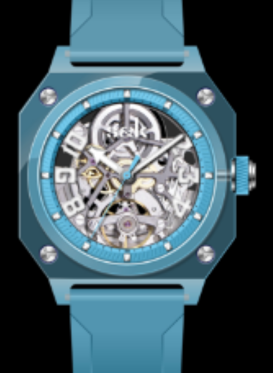 K9 glass case, customized multiple colors, 40mm, 50mm of lug-to-lug, skeleton watch, Silicone strap with 22-20mm width, 10 ATM wate-resistance, HangZhou 1A00A movement.