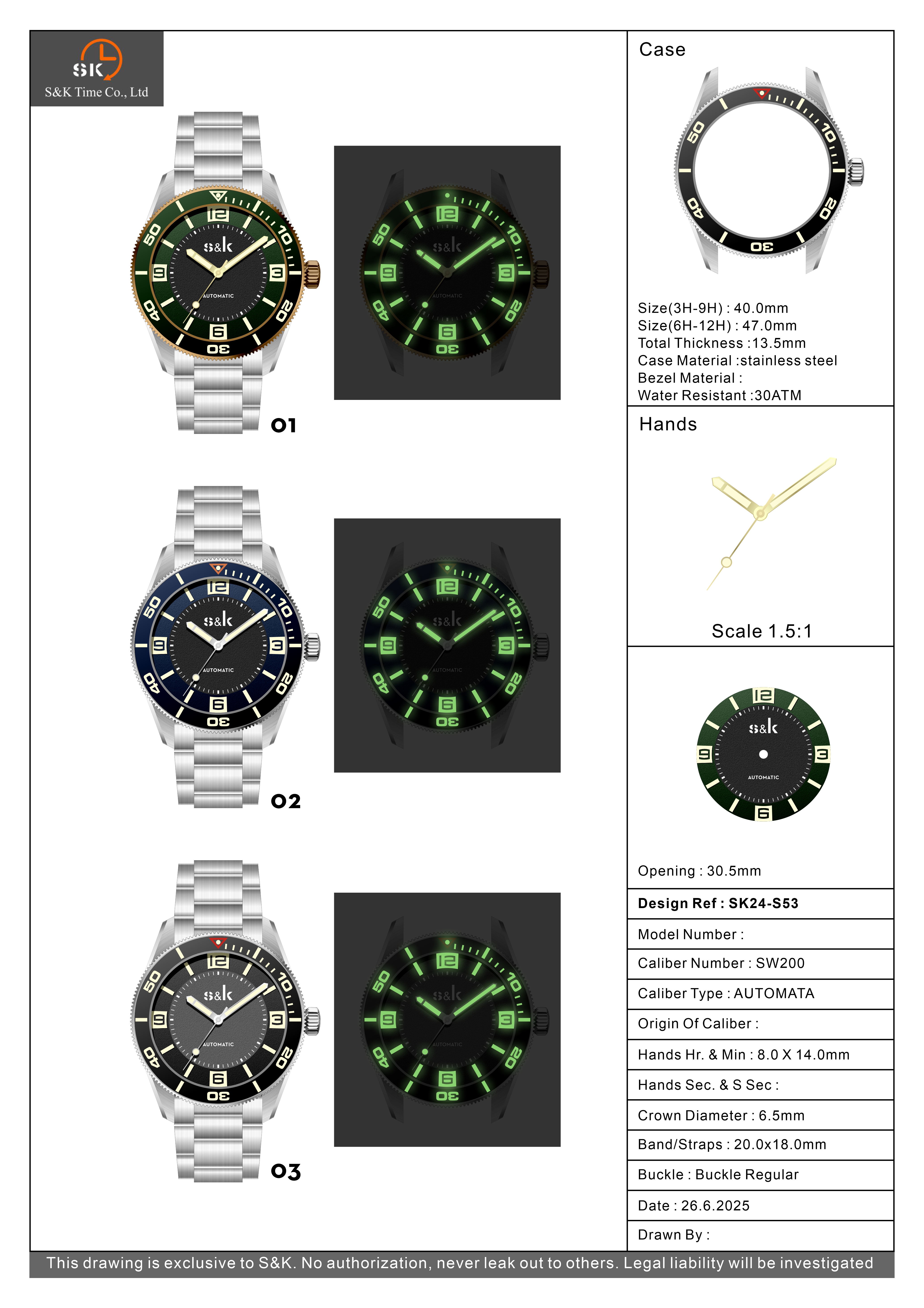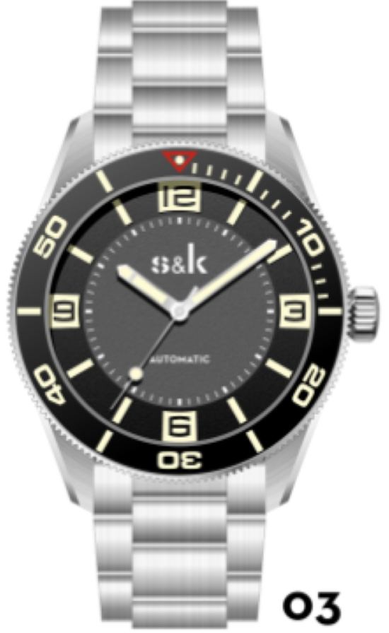 316L stainless steel case, 40*47mm, 13.5mm of thickness, unidirectional bezel with ceramic inlay, superluminova C3 for hands, bezel, block index number on the dial. 30ATM water-resistence, 20*18mm metal bracelet, Sellita SW200 movement.