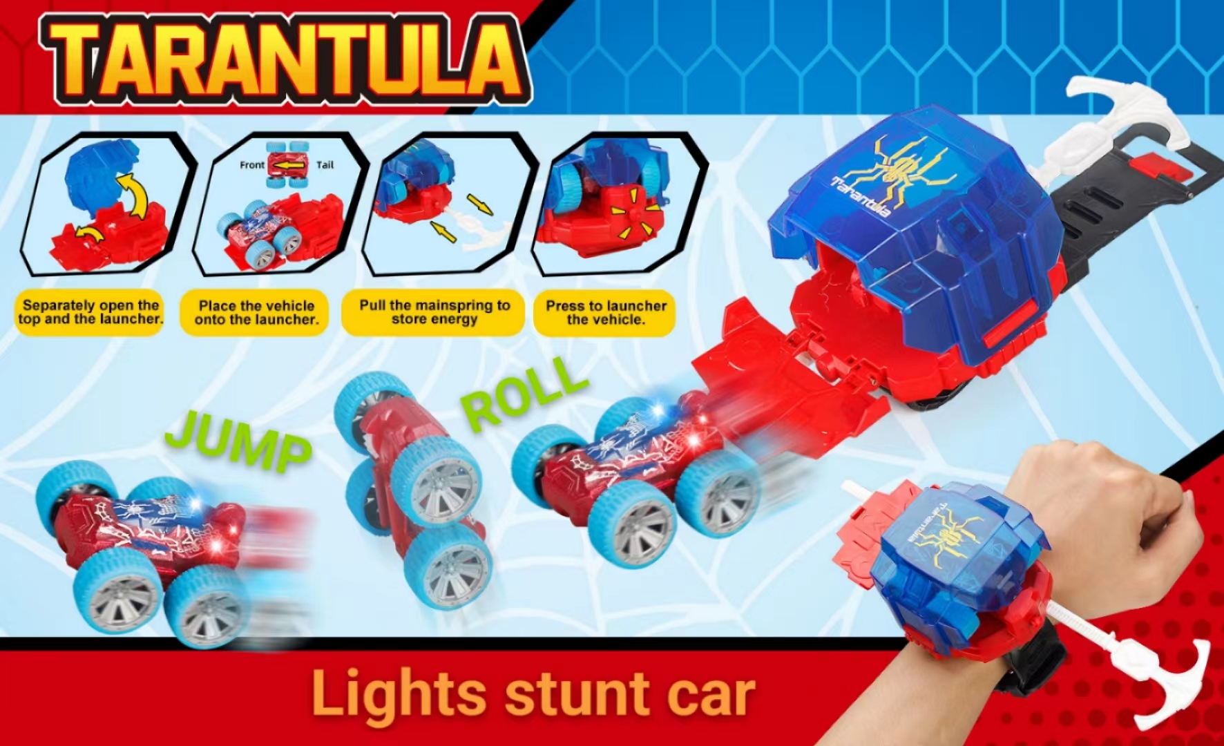 SMART WATCH LIGHT STUNT ENERGY CAR 1- Driving distance: 30M,2- Driving Speed:8-10KM/H,3- Watch size: 26x8 x 6.3cm,4- Main parts : watch x 1,clockwork x 1,light stunt energy car(included button cell) x 1,5-Function:Clockwork pullback forth continuously to store kinetic energy to launch the light stunt car