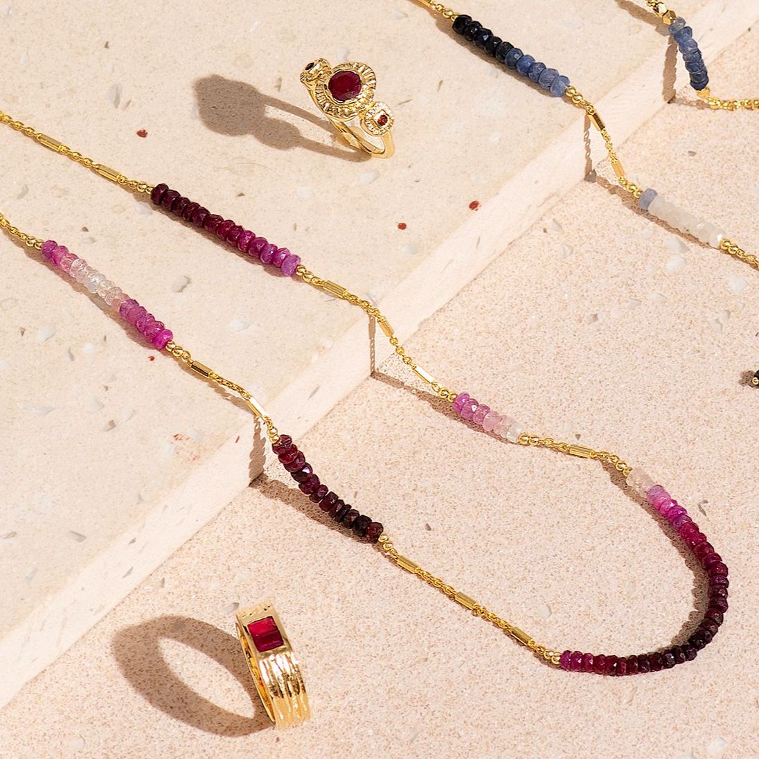 This ruby-shaded necklace is a captivating blend of elegance and color. It adds a touch of luxurious warmth and sophistication to any ensemble.