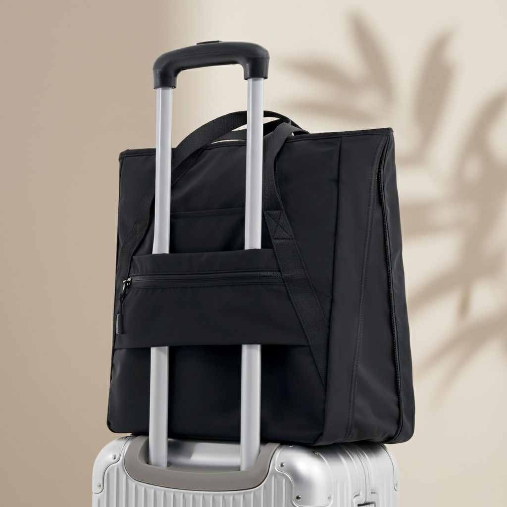 Travel smart with the integrated luggage strap, which also doubles as a zipper pouch—ideal for journeys near or far. Inside, a vibrant blue interior brightens your essentials and provides handy side pockets for easy organization. Durable, practical, and stylish, the Navro Tote adapts to your day, every day.