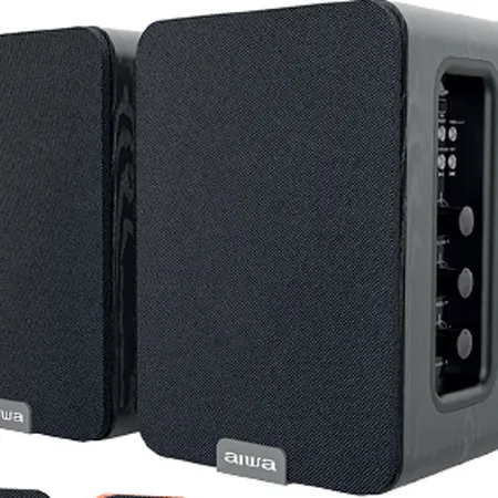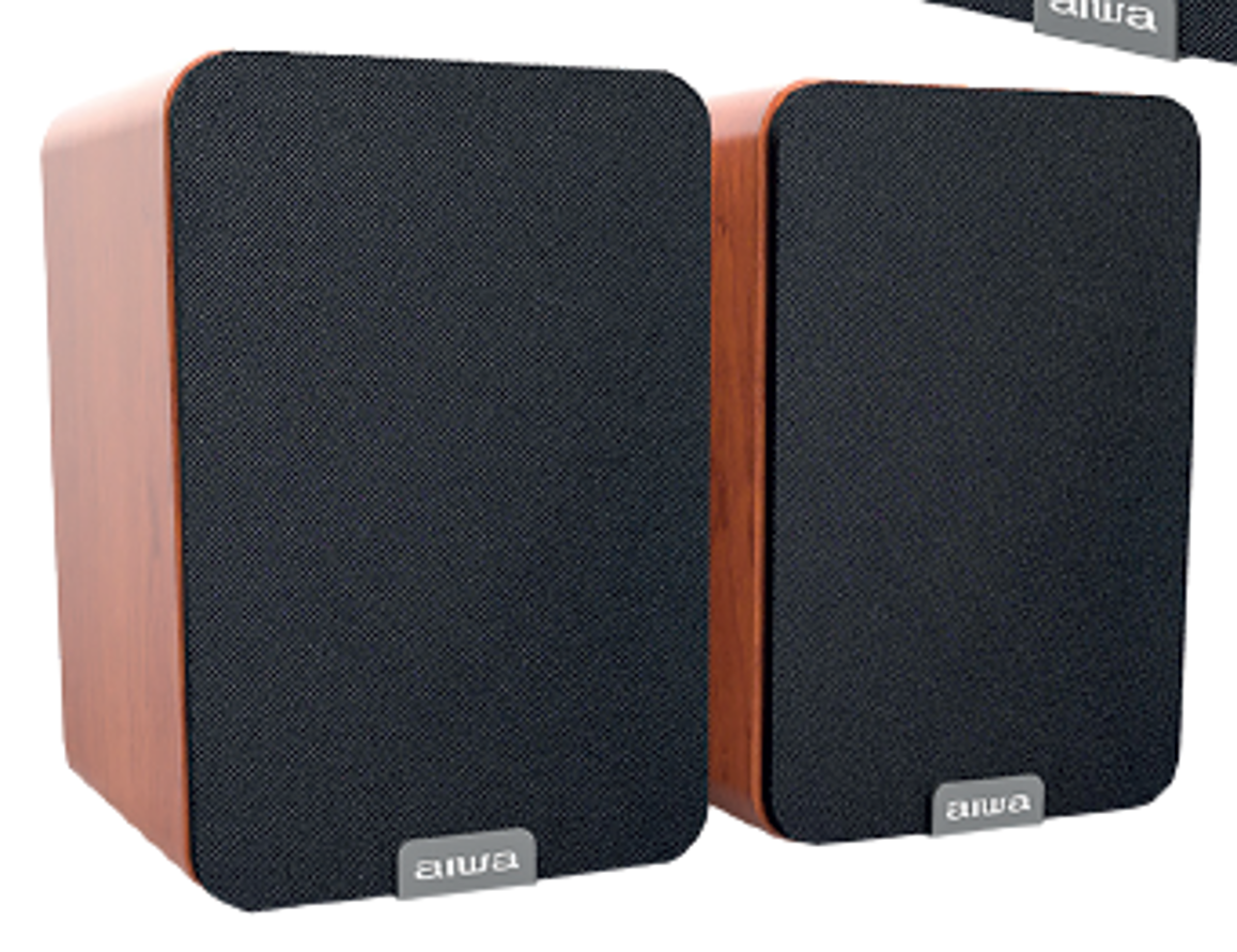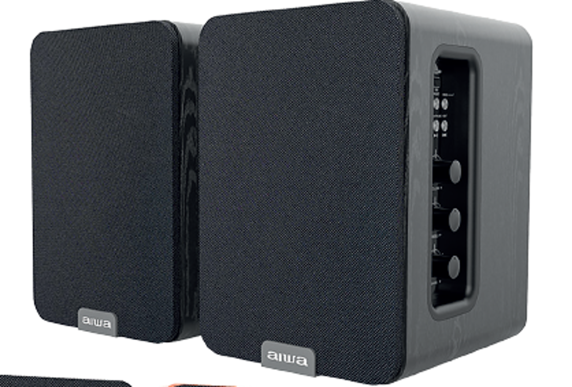 Active bookshelf speaker pair with 2x25W RMS Class-D amplification, Bluetooth 5.0, and a frequency response of 40Hz-20kHz. Features include a side control panel for volume, treble, bass, multi-color LED indicators, multiple input options (HDMI-ARC, USB, Optical, etc.), and removable cloth grills.
