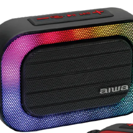 Features include RGB lighting, 5W RMS audio, waterproofing (IP66), Bluetooth V5.0 with a 10m range, and up to 8 hours of playtime.
