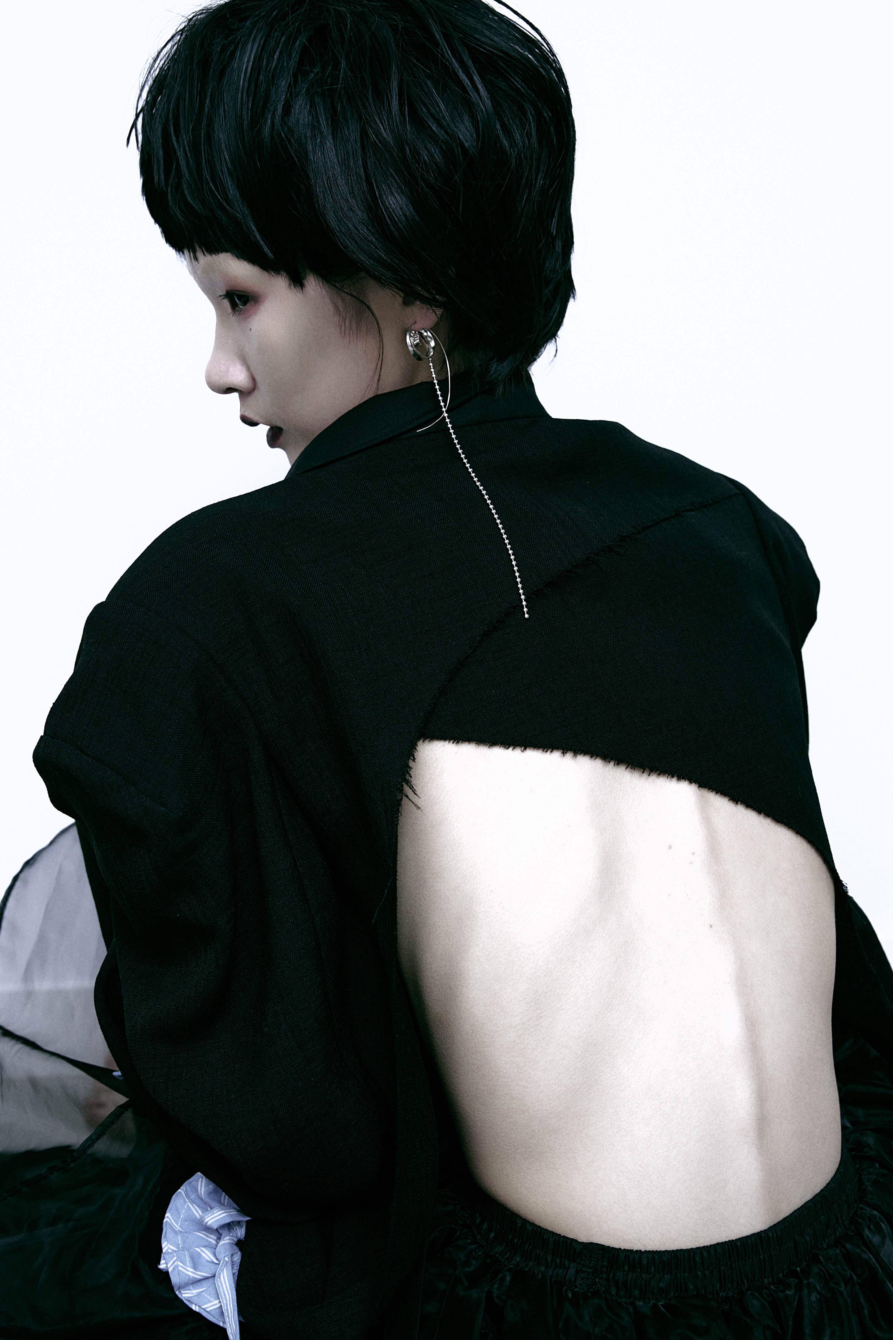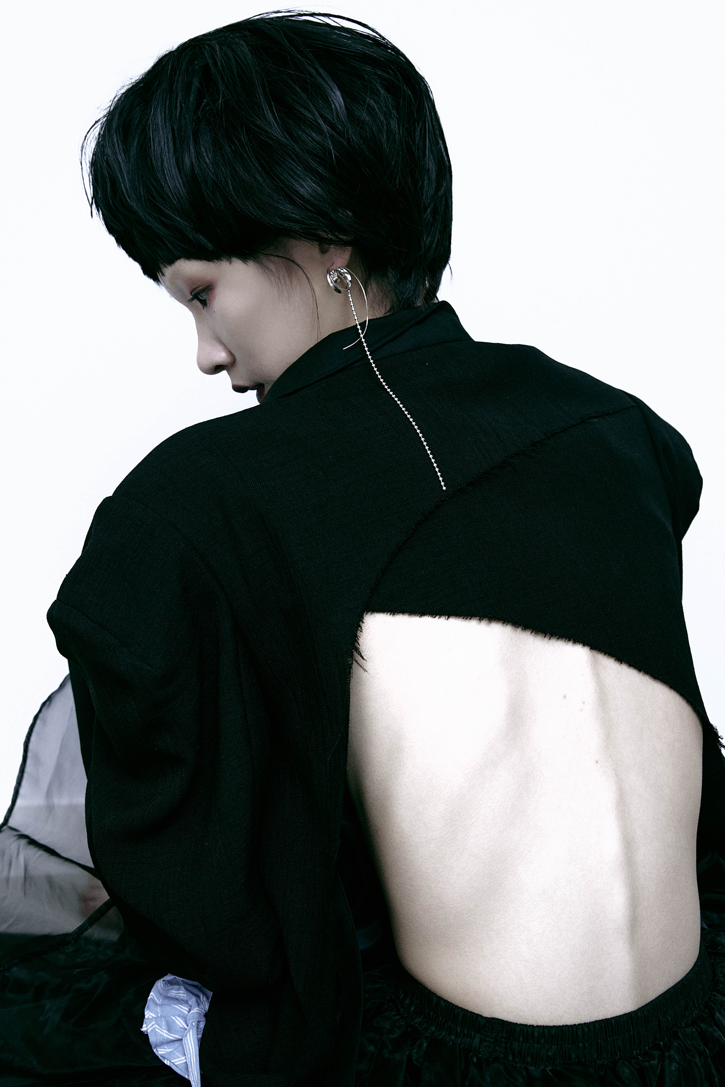 Dropping from the point of sensory intake, the chain traces the spine’s vertical line — externalizing an otherwise internal alignment. The piece transforms posture into presence.