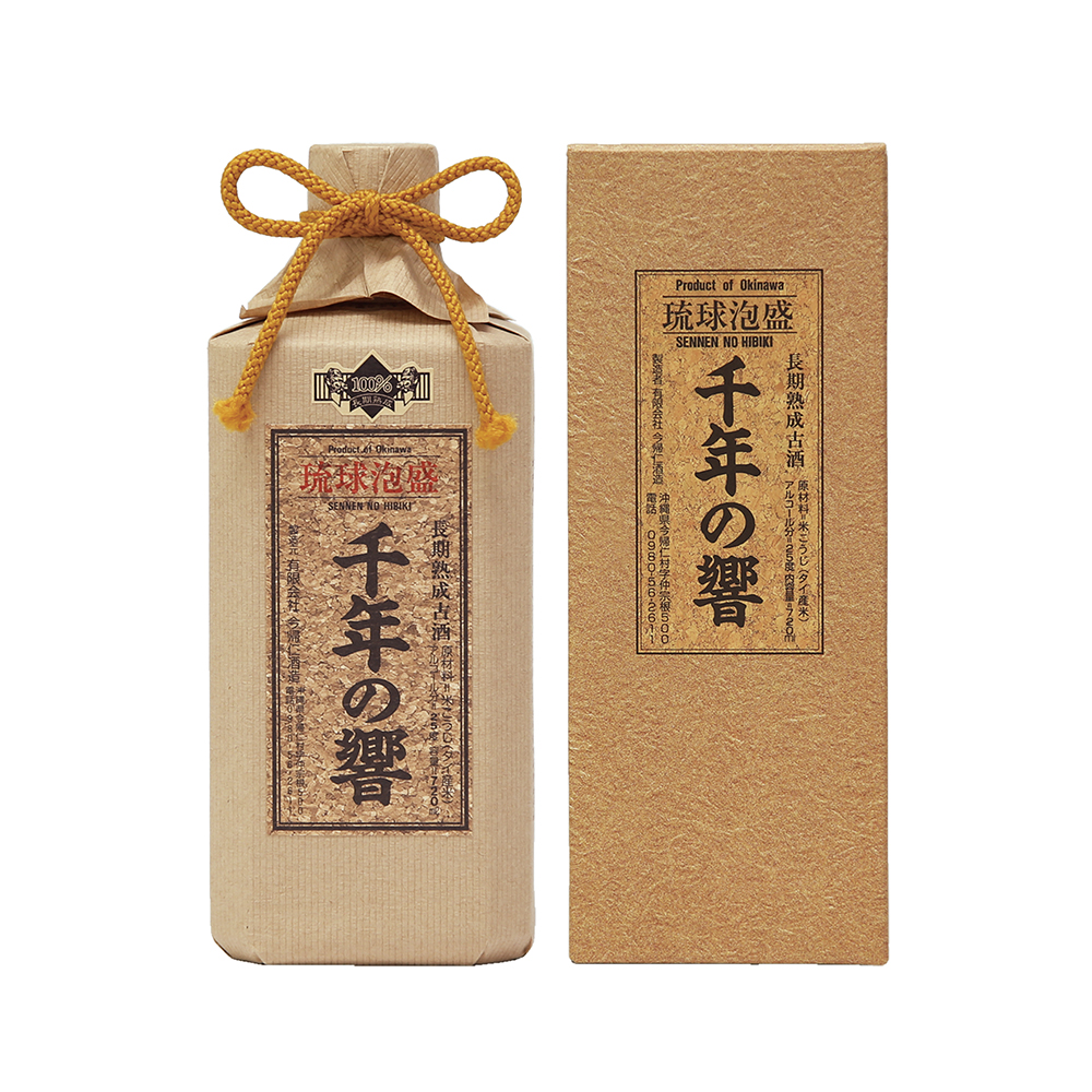 Sound of Thousand Years is an aged awamori ("kusu") by using Oak Barrels for aging methods, turning the distilled and transparent raw sake into amber to create a mild aroma. After the long fermentation in oak barrels, the wine has a soft brandy-like sweetness that is mellow and rich, without adding any additives. The bottle is designed in a soft-hued packaging, and the label is made of cork, making it perfect for gifting or personal use.