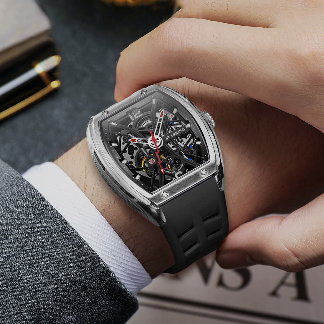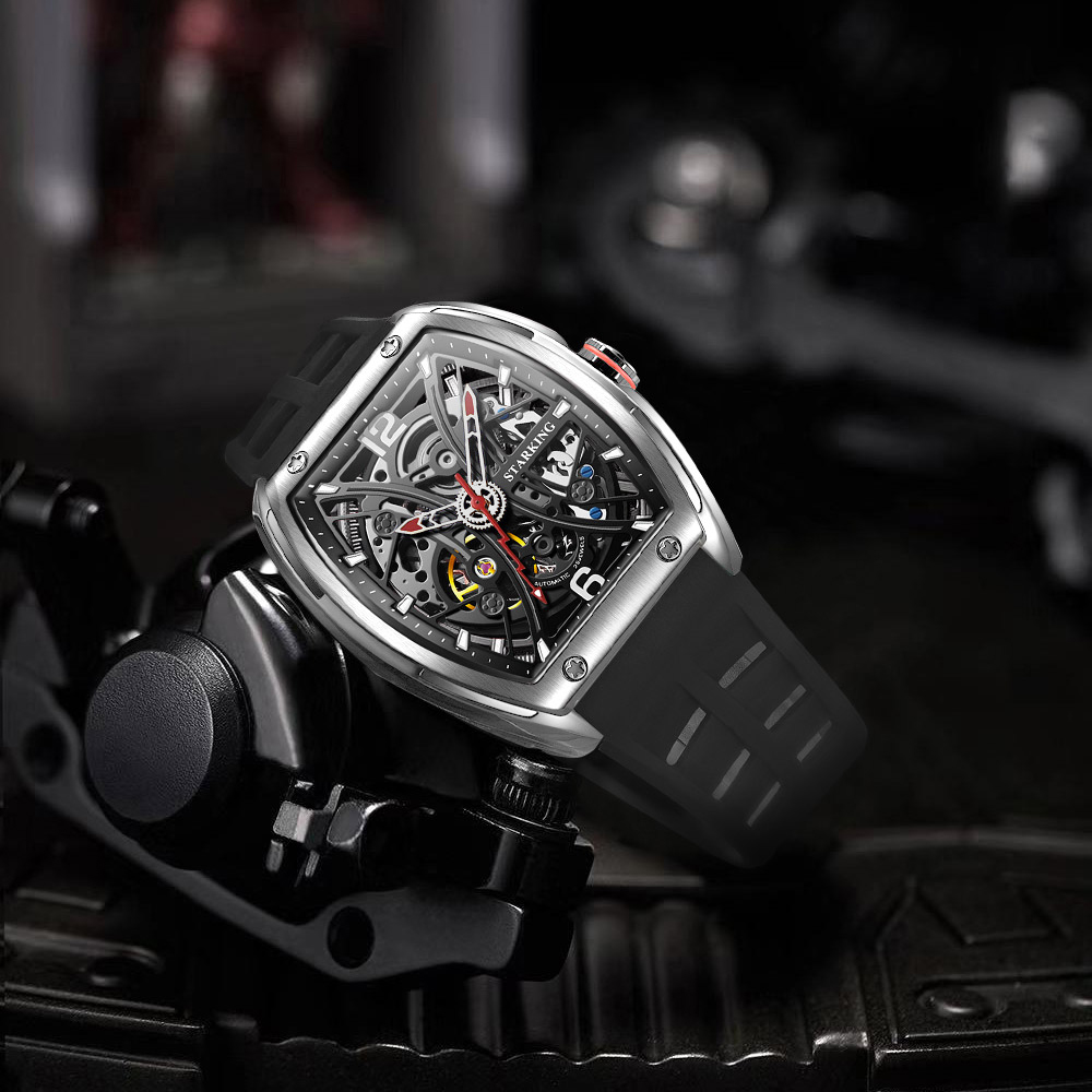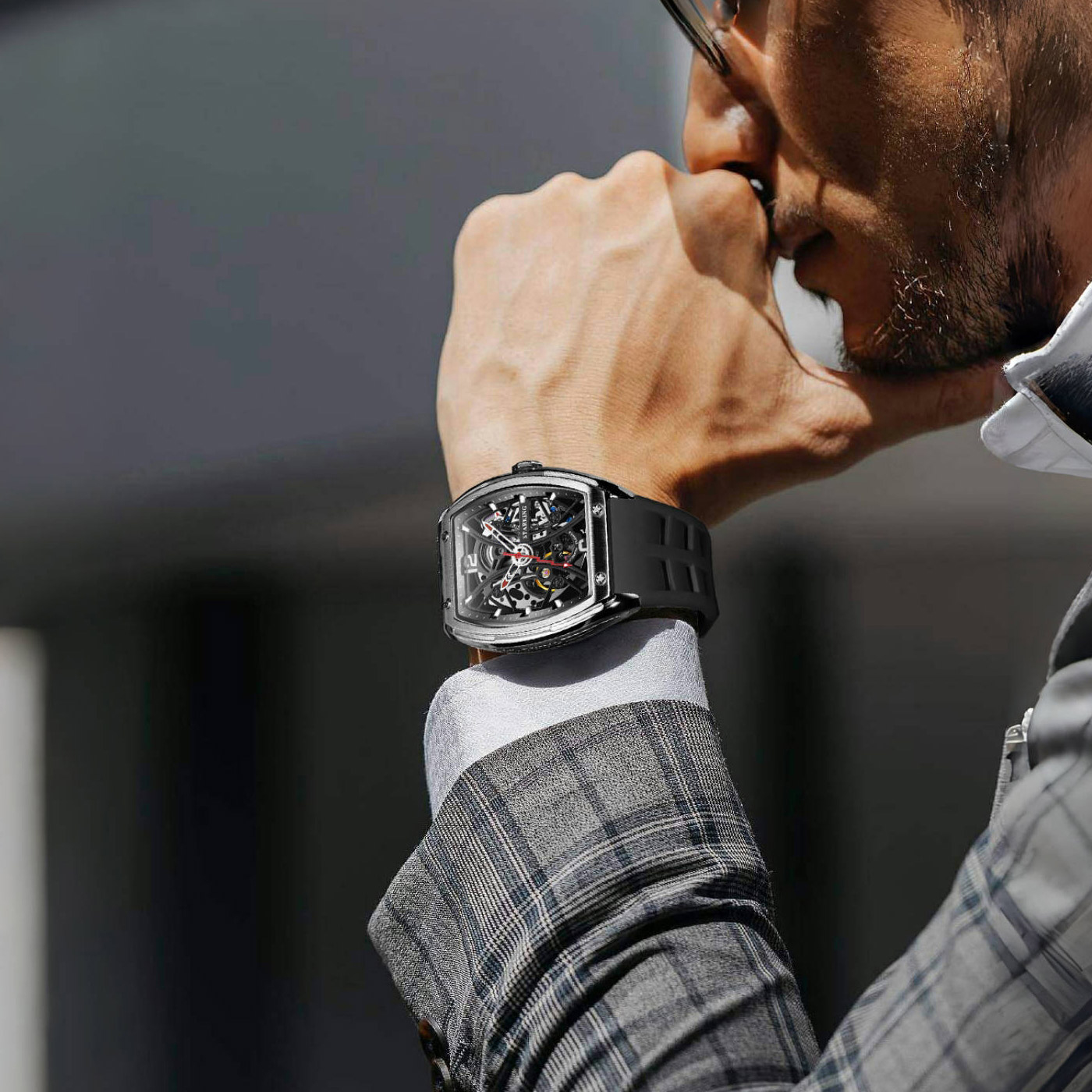 Unique skeleton design: Unique hollow design, barrel-shaped stainless steel case, fully transparent dial showcasing sharp mechanical lines, listening to the movement rhythm, and experiencing the mechanical aesthetics of every inch. The fusion of engineering and art praises the pure aesthetics of exquisite watches in every inch.