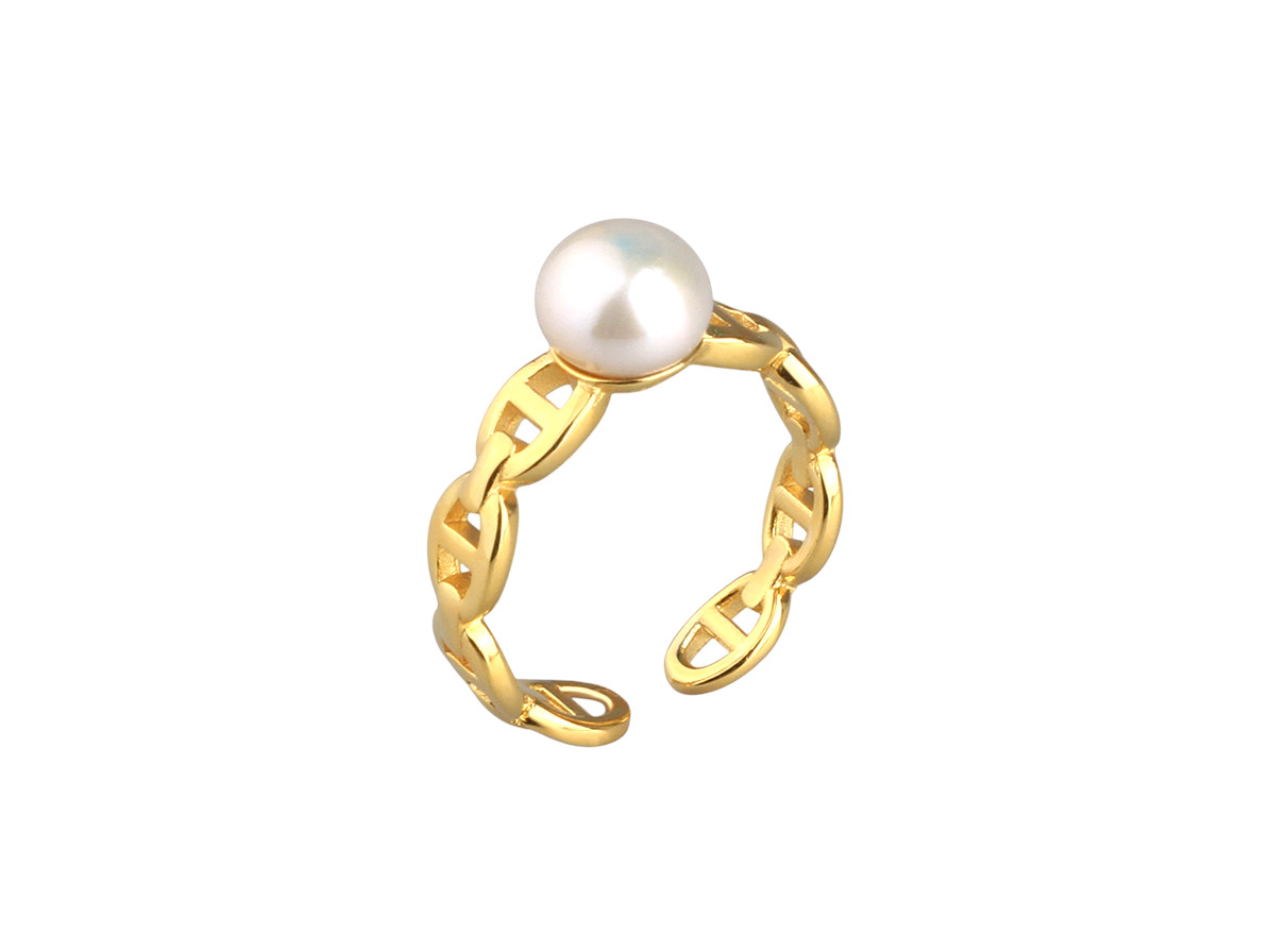 STERLING SILVER RING WITH 7.5-8MM BUTTON FRESHWATER PEARL, YELLOW GOLD PLATED