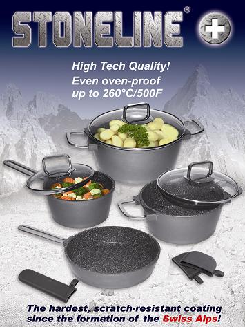 Healthy and non-fat frying like on a natural hot stone. Absolute scratch-resistant non-stick coating with real particles of stone. Best taste and vitamin gentle cooking without any kind of fat. As resistant as stone but not heavy. No burning and no scorching.