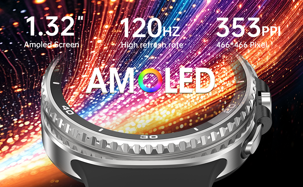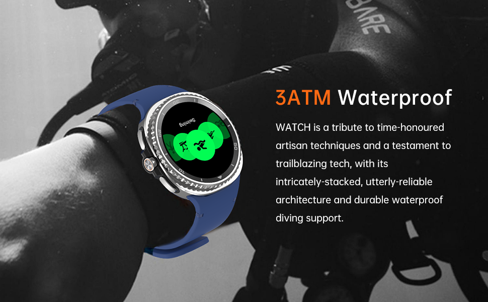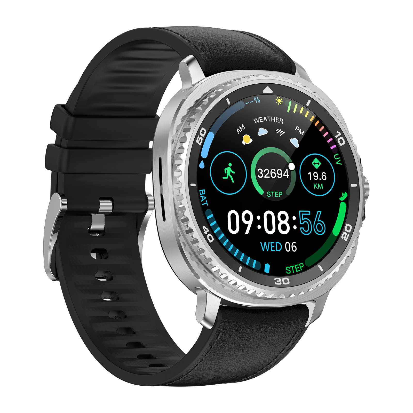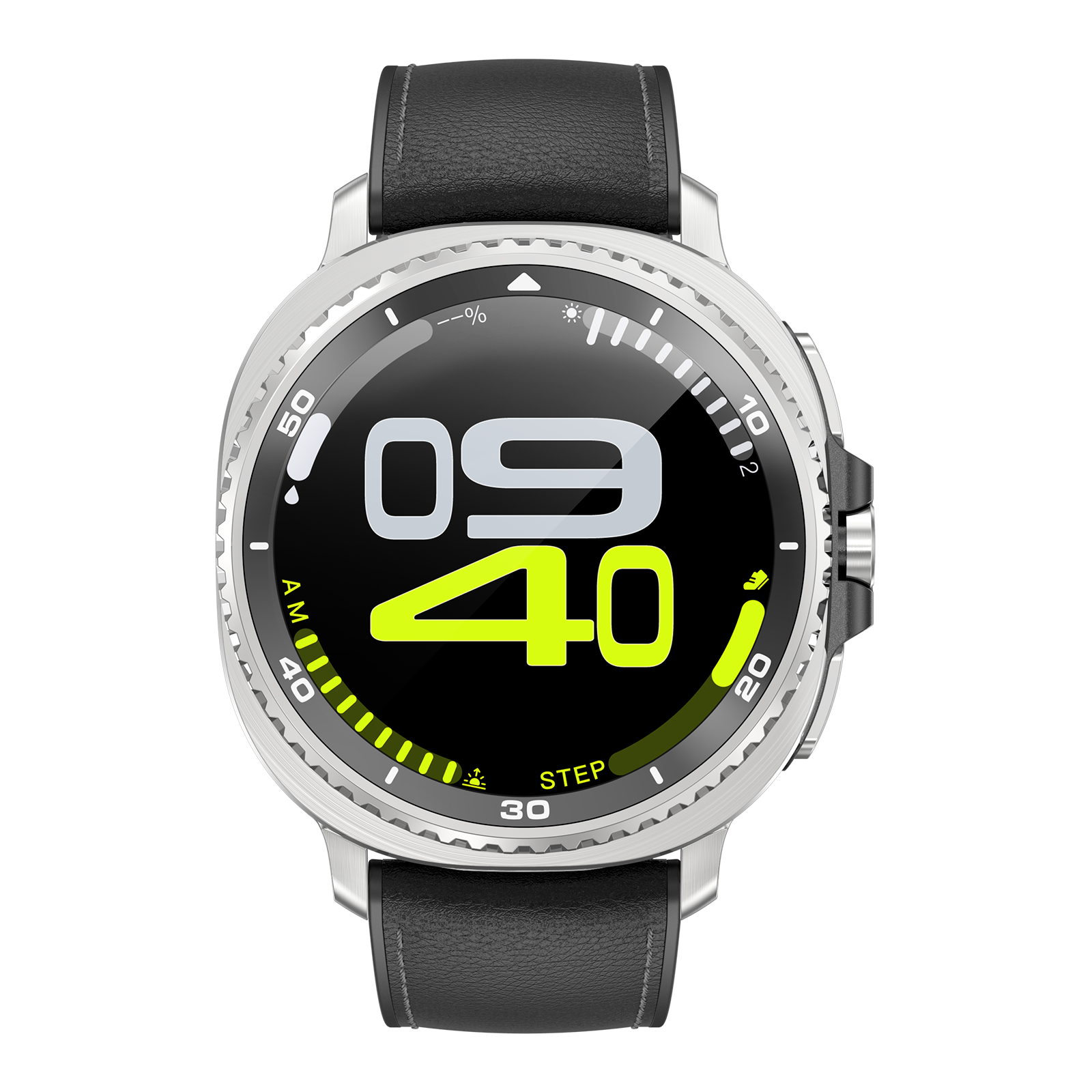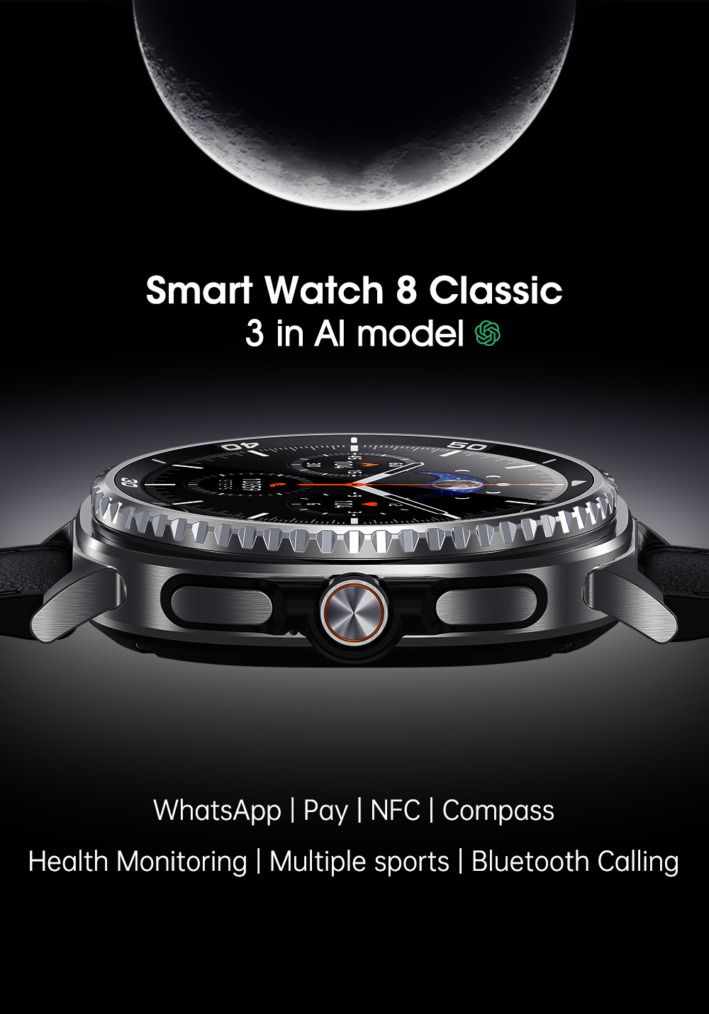 Main features: Rotating bezel, IP68 waterproof (swim-proof design), WhatsApp chat (text, voice, emoji, quick replies), “Hey Michael” offline voice assistant, anti-motion sickness, customizable main menu (can move, delate and add), compass, photo image sync, noise measure, translation, pinch-to-answer, ChatGPT, AI watchface creation.