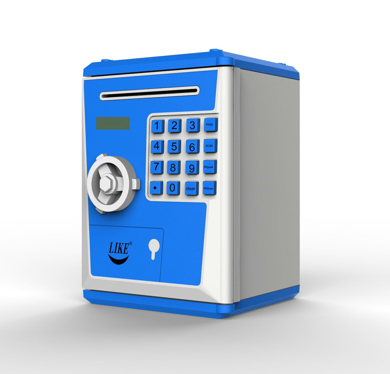 Big Size,can help childrens to save more moneys Working with Battery Built-in Motor,Automatic paper money roll in Voice indication for TIME and OPERATIONS Password entery for withdrawal Simulated finger print entry Able to record and check last three times of entry