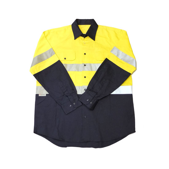 This is a safety shirt that comes with a color-blocking appearance. It is designed with a classic point collar, long sleeves and a button-up front. This safety shirt is soft and comfortable to wear.