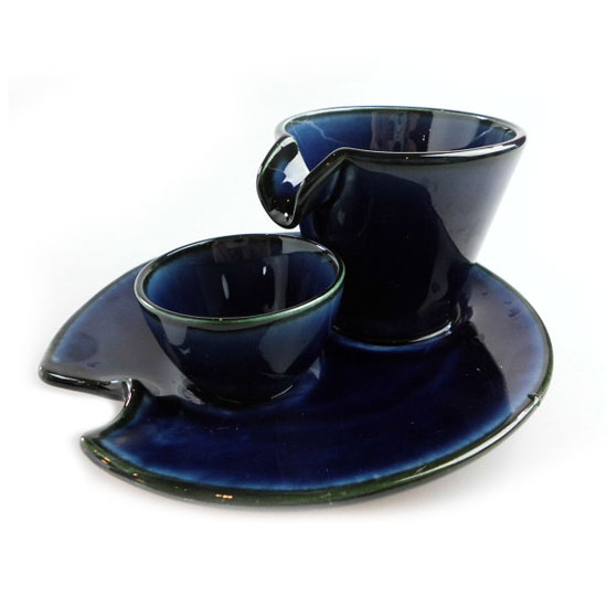 This is a Japanese sake cup featuring a bowl-shaped bottle, a tiny cup and a saucer. The cup set comes in a navy colored design with a polished finish. When you pour the sake into the mug, it create an effect of a waterfall. Master sake serving etiquette with this Japanese sake mug set.