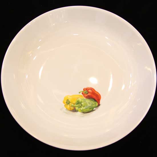 This salad bowl is delicately crafted to give a polished finish. It is decorated with vegetable patterns to add a touch of uniqueness. The salad bowl makes a great addition to your tableware collection.