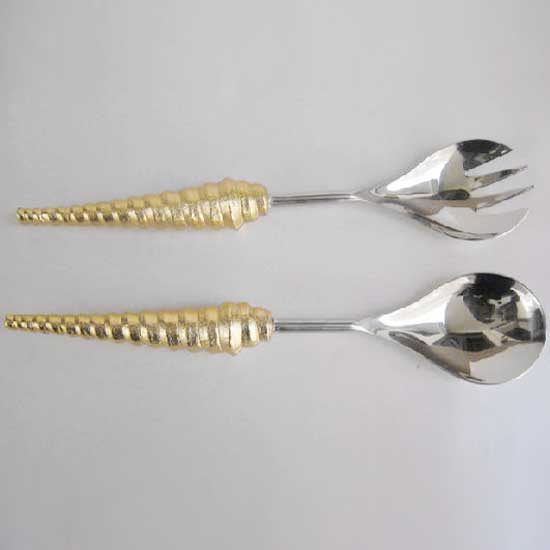 This is a pair of salad servers with a nice gold design. It features a golden handle in a unique shape with a rugged finish. The high-quality metal material promises an extended service life.