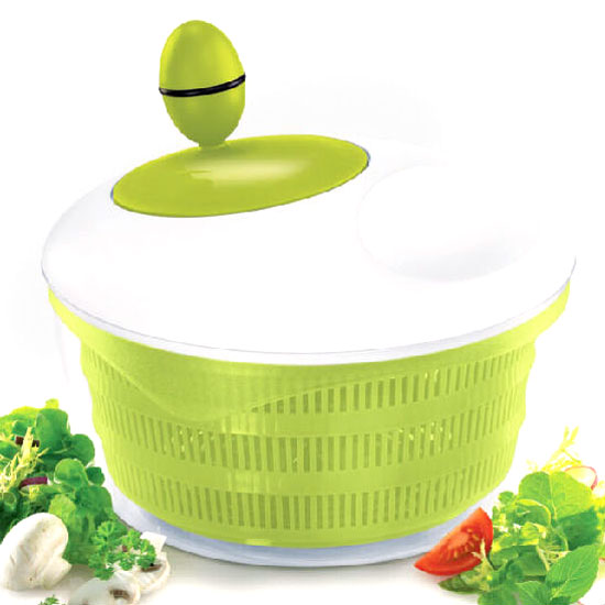 This is a salad spinner made of food safety plastic. It comes in green with a white cap for a fresh look. This item is a practical addition to your kitchen.