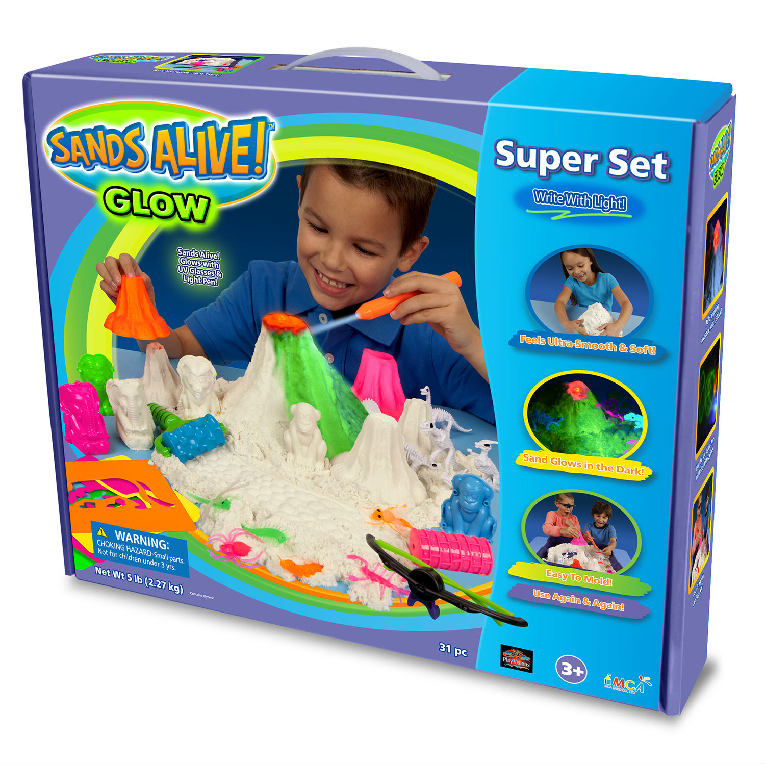 Sands Alive! Glow is fun and easy to use. Play with it in the light, then move to the dark. Use hands free lights and glow tools to create a new world of imaginative play.