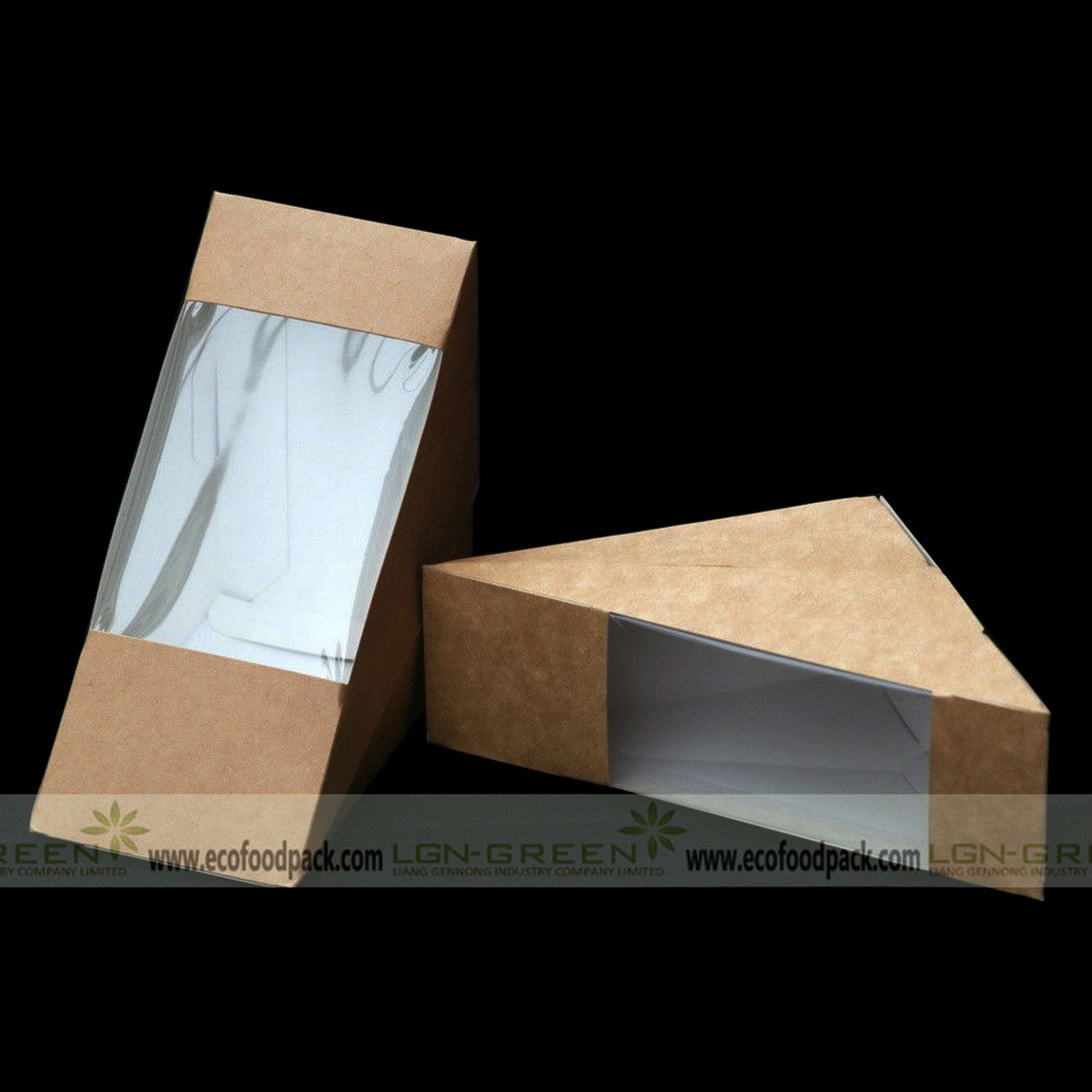 This triangle deep-fill sandwich box is made from food-grade paperboard, while laminated lining allows you to slide the food out easily. Mouth-watering fillings can be displayed clearly through the window, which comes in PLA bio-plastic (corn starch) for eco-friendliness.