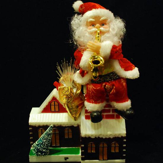This Santa Claus decoration features a Santa Claus and a house in an exaggerated scale. The cute Santa Claus holding a saxophone adds happiness to the Christmas atmosphere. The thin optical tubes beside it glow vividly in the dark.