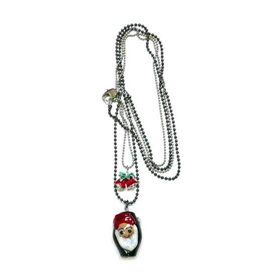 This multi-strand beaded necklace is adorned with vivid Santa Claus and Christmas bell pendants. It is secured with a lobster claw closure. The necklace is a perfect accessory for you during the Christmas season.
