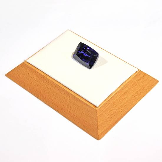 This is a royal blue coloured sapphire which is of cushion shape with set cut. The sapphire is polished and has a clean clarity.