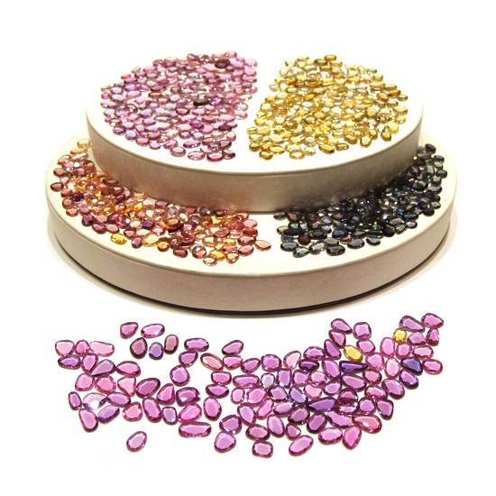 As shown are pieces of sapphire in different shapes and colours. They are in double rose cut. They can be combined to make jewellery such as necklace, bracelet, pendant, etc. The large variety of colours is perfect for matching different clothing.