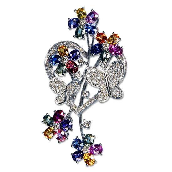 This brooch for ladies has an openwork floral design set with fancy sapphires. Blue, purple, green, orange and yellow sapphires are prong-set to form five small flowers, which perfectly complement the beauty of the glittering butterflies and heart.