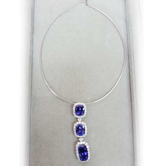 This is an elegant necklace that features three cushioned sapphire ornaments. This necklace is well paved with dazzling diamonds for added sparkles. This fine jewelry is surely an ideal addition to complete your jewelry box.