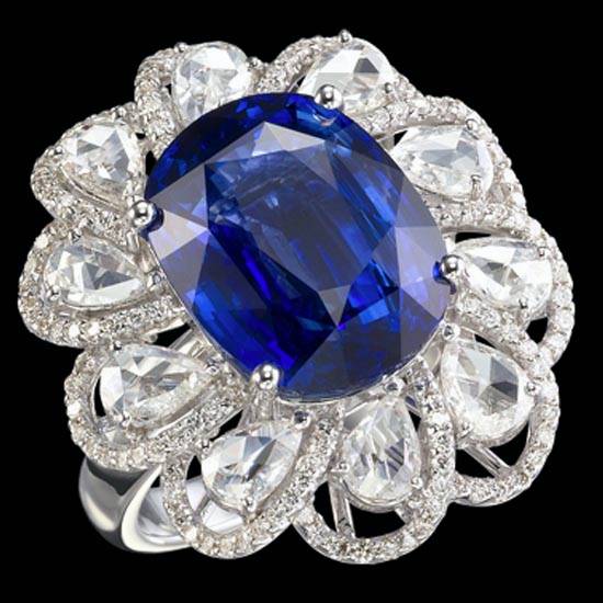 The sparkling diamond ring boasts a cushion-cut sapphire with an alluring look. The flower design is accomplished with the round and water-drop diamonds. This luxurious sapphire diamond ring makes a timeless expression of beauty.