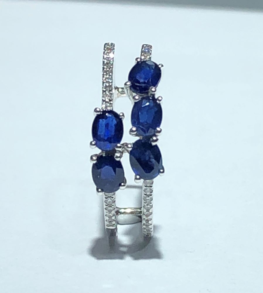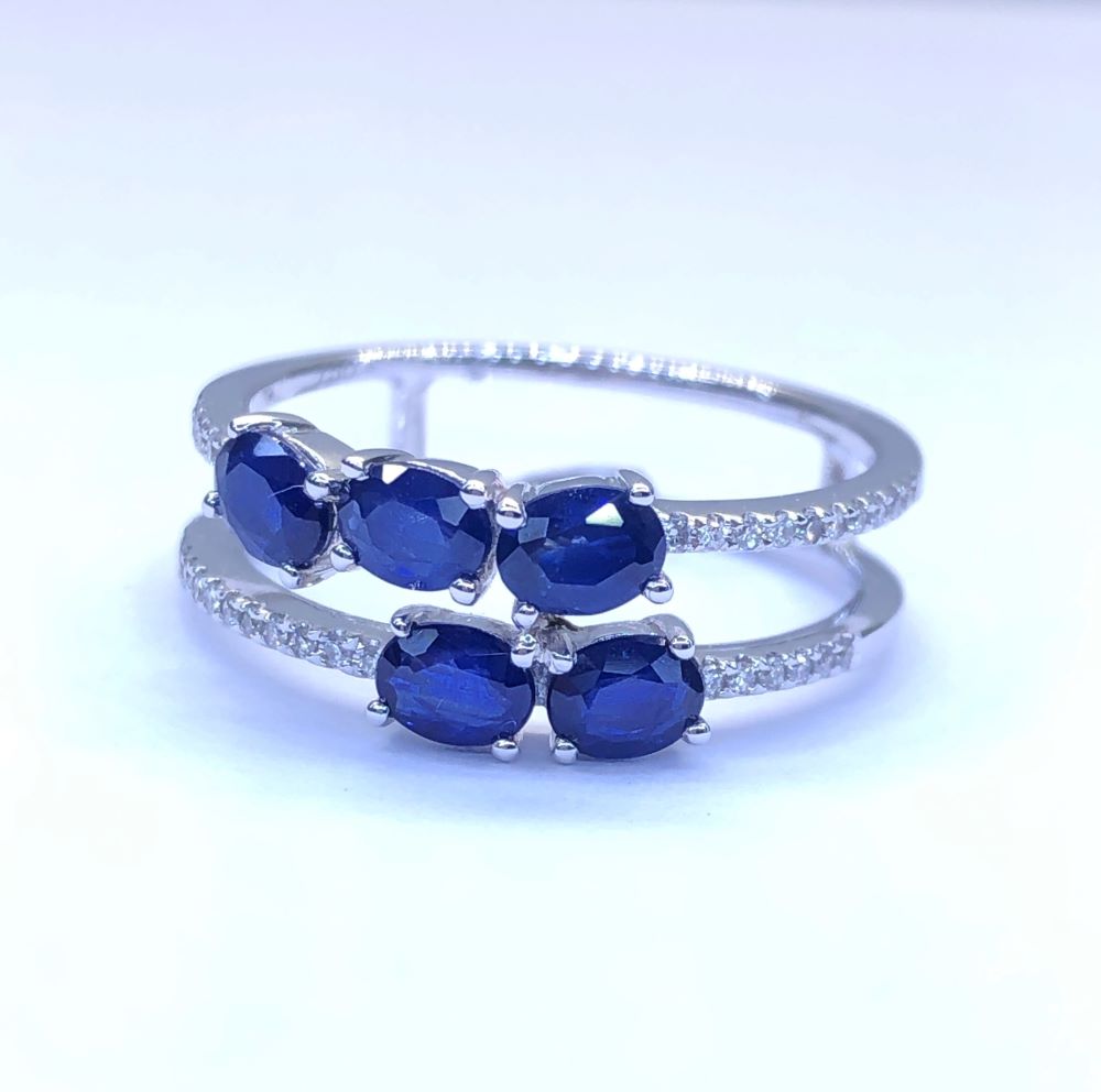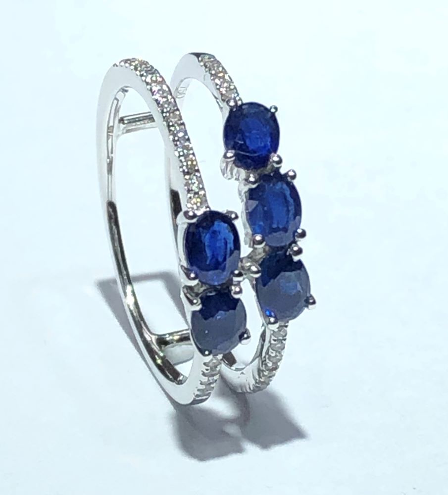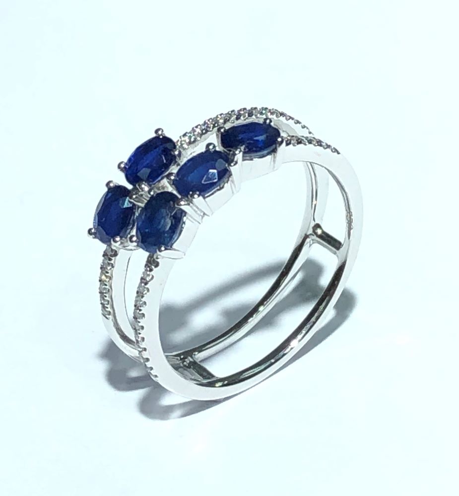 五顆蛋形藍寶清簡的排列在鑚石上,更顕藍色之美