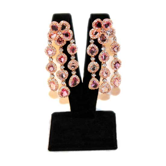 Presented is a gorgeous pair of earrings designed in a pendent style. The earrings are set in shiny rose gold, embellished with drop-cut pink sapphires. Diamonds are adorned around the sapphires to show extra glamor.