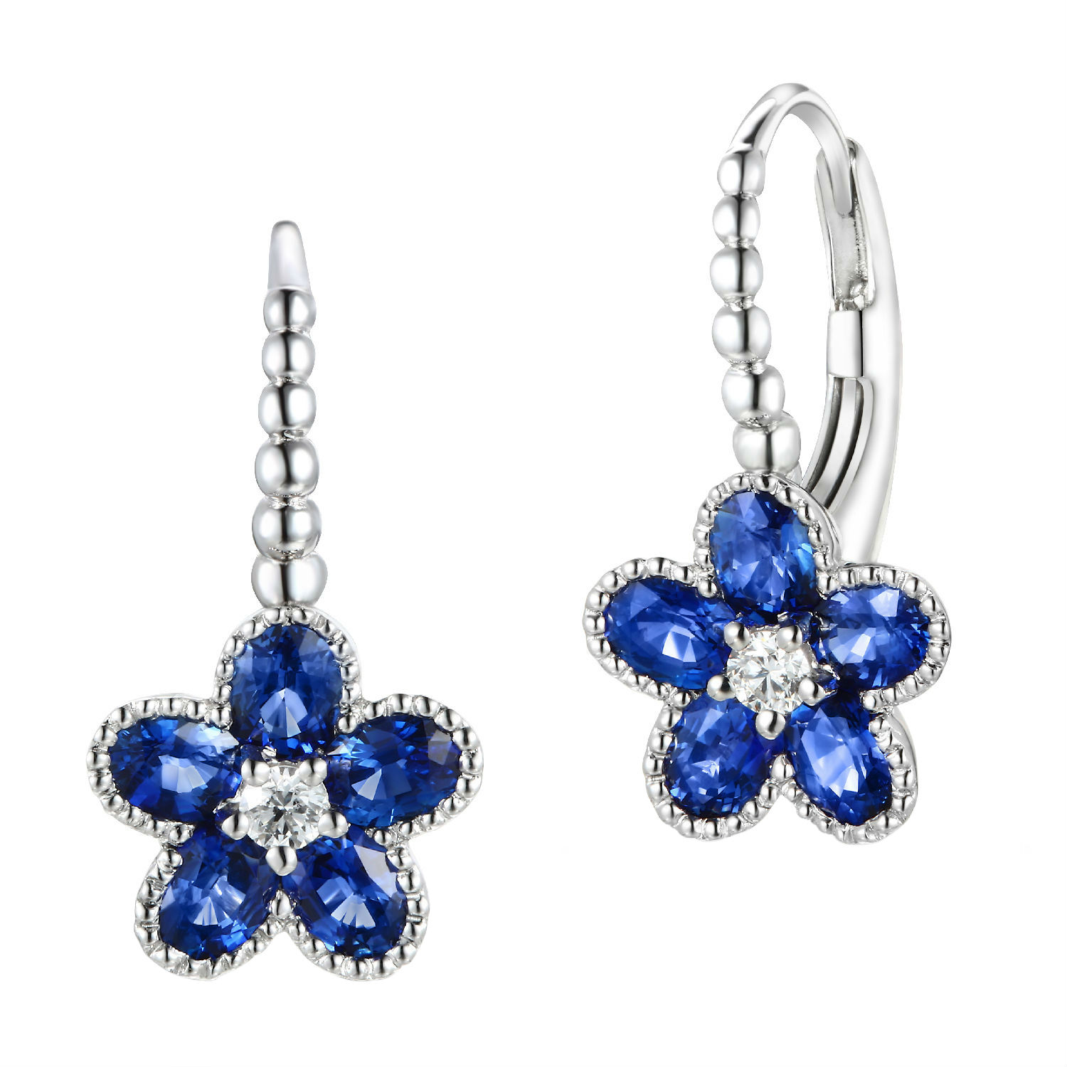 Complement your feminine demeanor with this pair of sapphire earrings. The exquisite floral drop exudes radiant shine through its sapphire petals and diamond bloom, lending a refreshing sweet accent for a truly elegant look. The lever back finish with bead-like embellishments further ensures secure wearing at versatile ensembles.