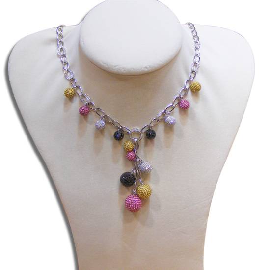 This is a sapphire necklace set in 18k white gold. The charm necklace features 14 balls in different sizes set with black and white diamonds, and yellow and pink sapphires. It comes with a cable link chain.