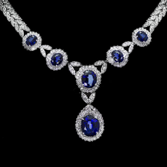 This is a sapphire necklace that comes in a princess style with round gemstones. Accented with diamonds, this necklace is sparkling and gorgeous. This sapphire necklace has excellent craftsmanship.