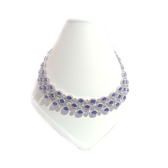 This is an elegant necklace that is accented with well-laid sapphires and diamonds for added luxuriousness. It is made of 18K white gold and shimmers with a high-gloss finish. This gorgeous necklace is an ideal addition to complete your fashion collection.