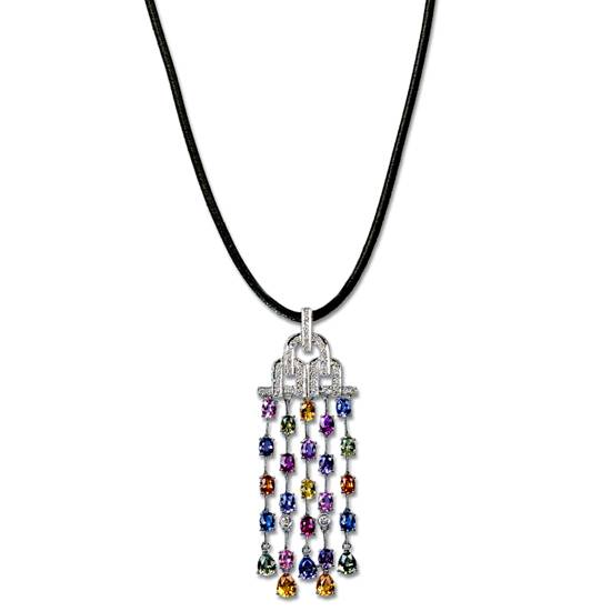 This is a sapphire pendant for ladies and women. The pendant features fringes of fancy sapphires in various colours, which include purple, blue, orange and green. It is an elegant and stylish piece for matching both fashion clothing and elegant wear like evening dresses.