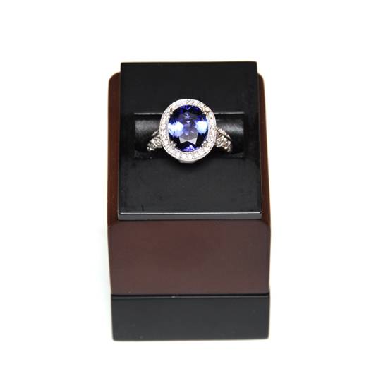 This is a ring decoratred with an oval shaped sappire main stone. The ring is also decorated with white diamonds in channel set.
